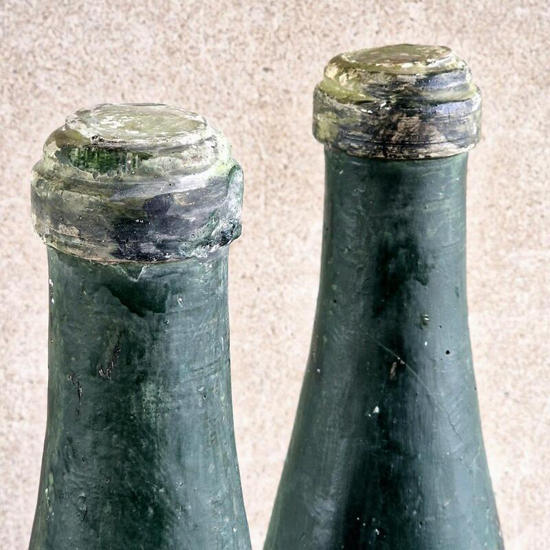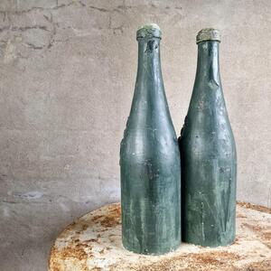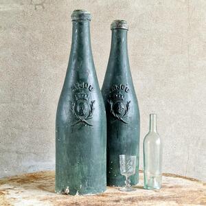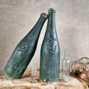 An exceptional set of 2 XL plaster wine bottles of the Anjou wine, publicity bottles made of plaster and fabric, original dark green paint, with typical Anjou embossed label, good condition with some minor cracks and chips, France 1930