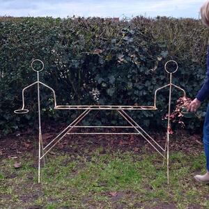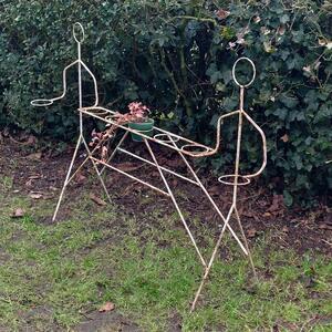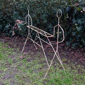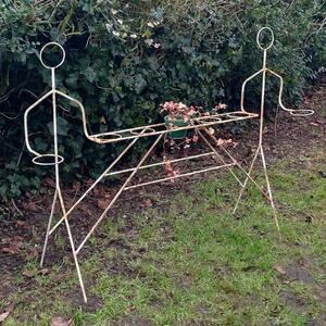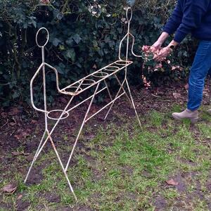 A rare and funky metal plant rack showing 2 linear persons carrying a holder for planters, both are linked by a bar with 5 plantholders, weathered white paint with traces of rust, good stable condition, France 1960