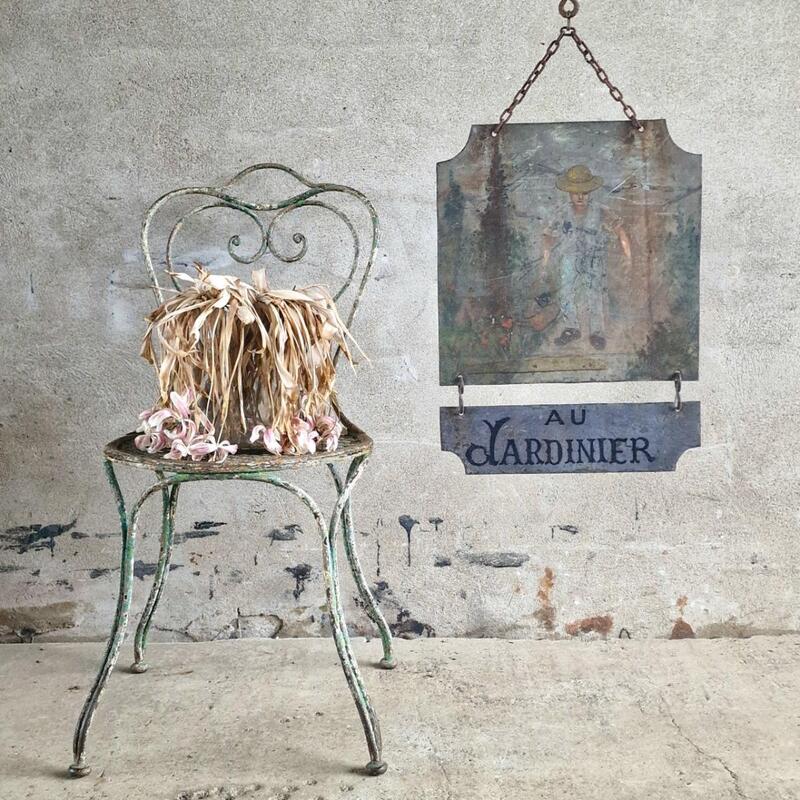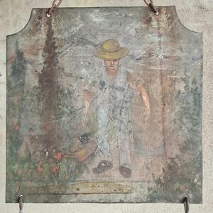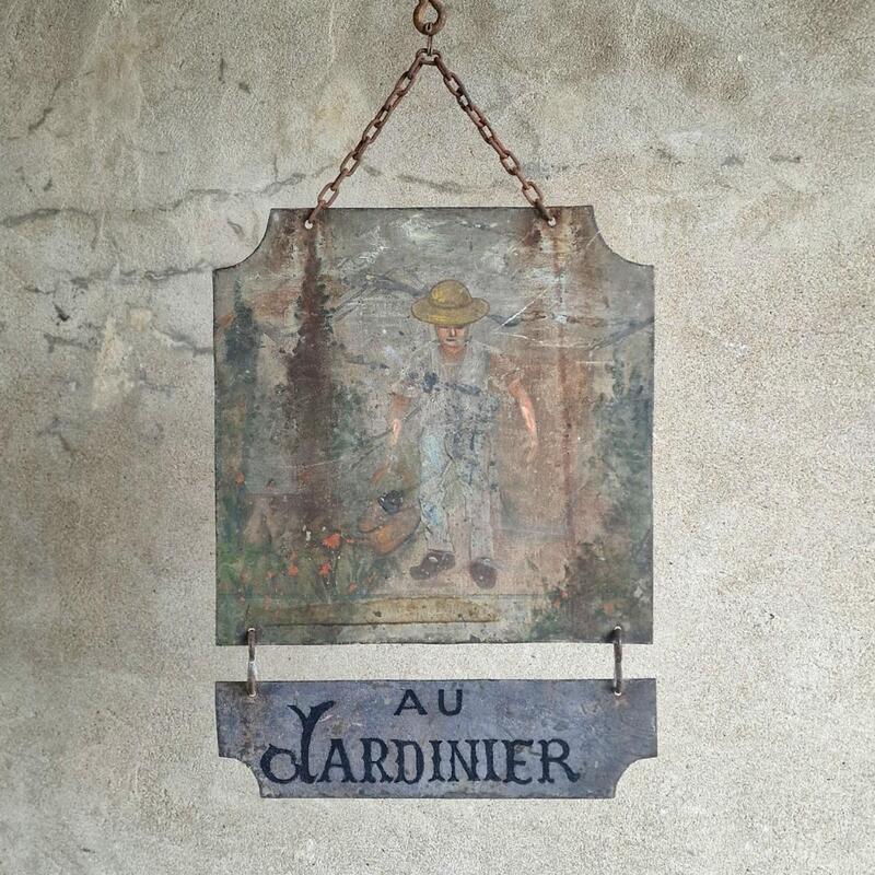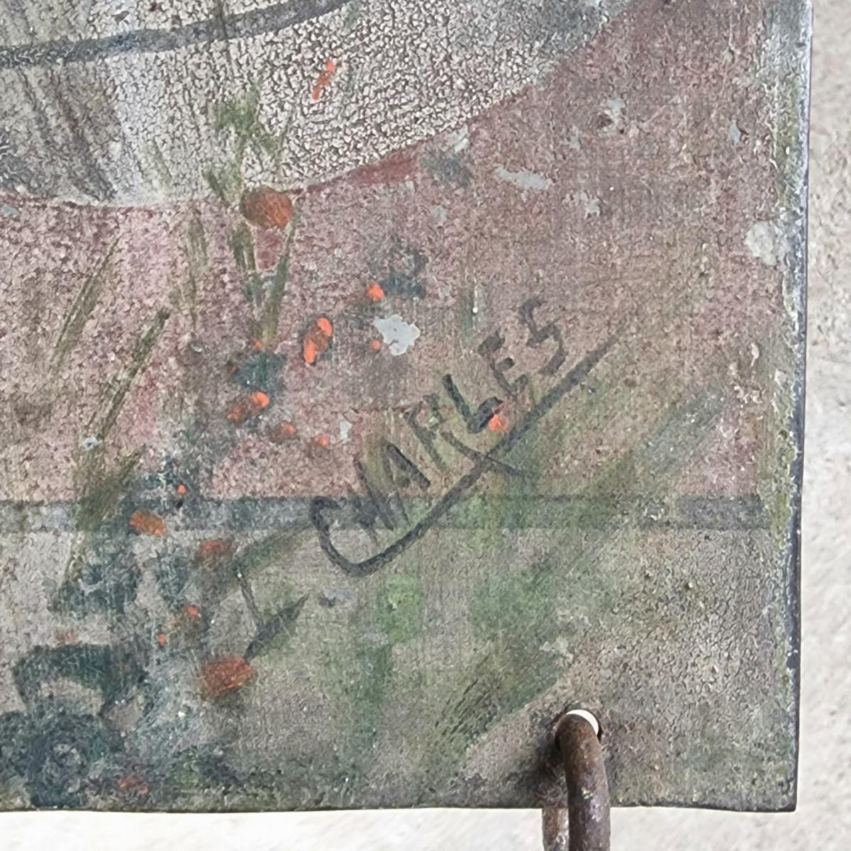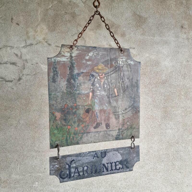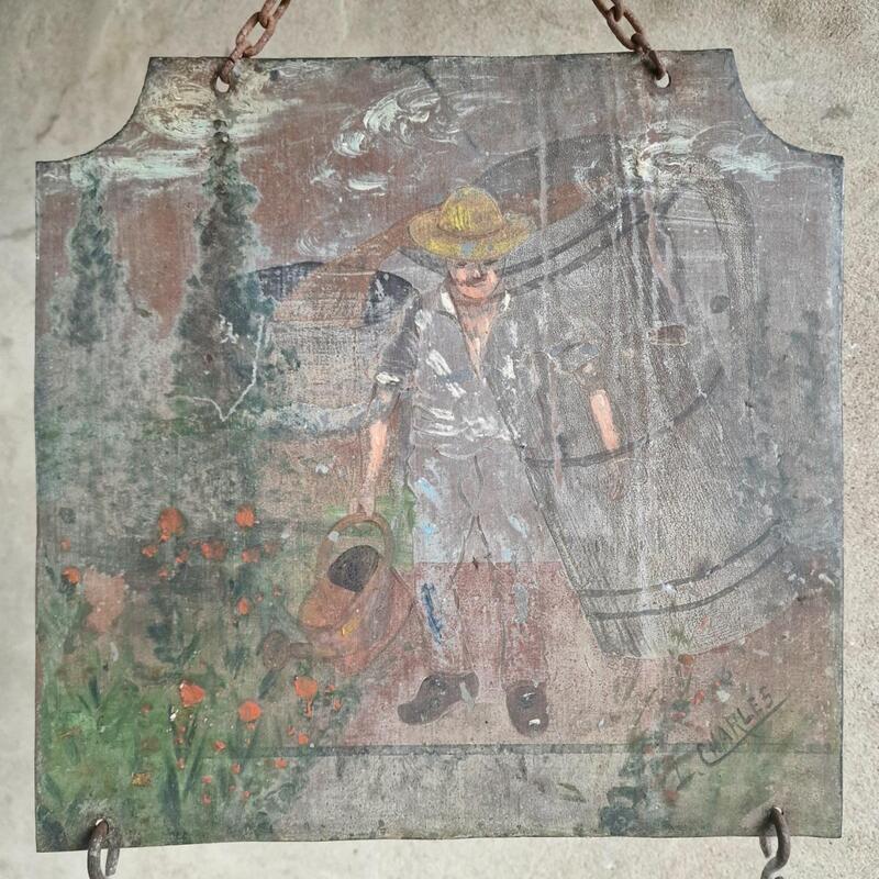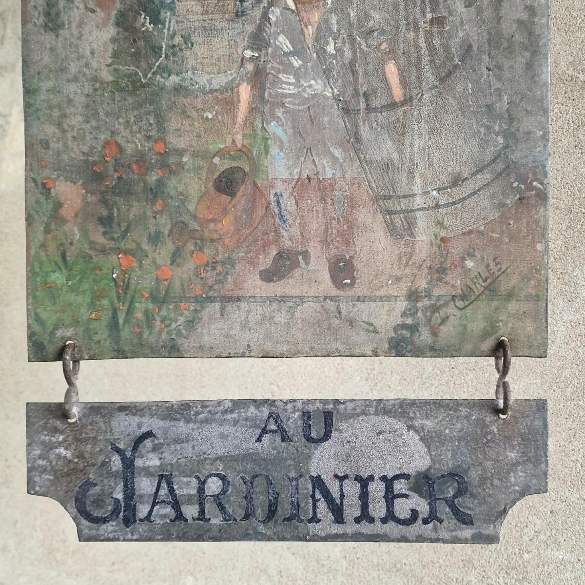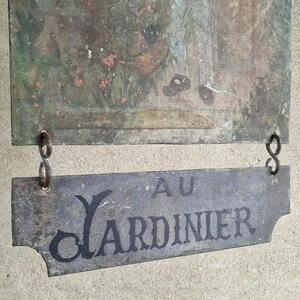 Very hard to find primitive gardener publicity panel in metal, 2 parts hanging together, double sided, old paint that shows an underlaying "painting" on one side, signed by artist Charles (Van Gogh? :-) ), France 1880
