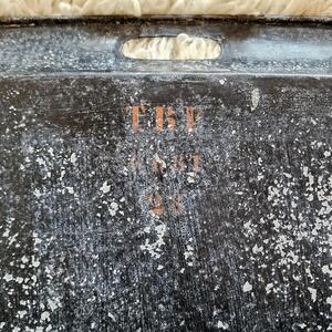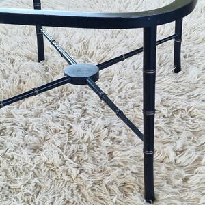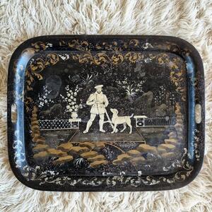 An admirable metal side table with removable hand-painted tray showing a hunter with his dog, on black wooden base with bamboo imitation legs, very good and stable condition, initials and number on backside tray, France Mid 20thC