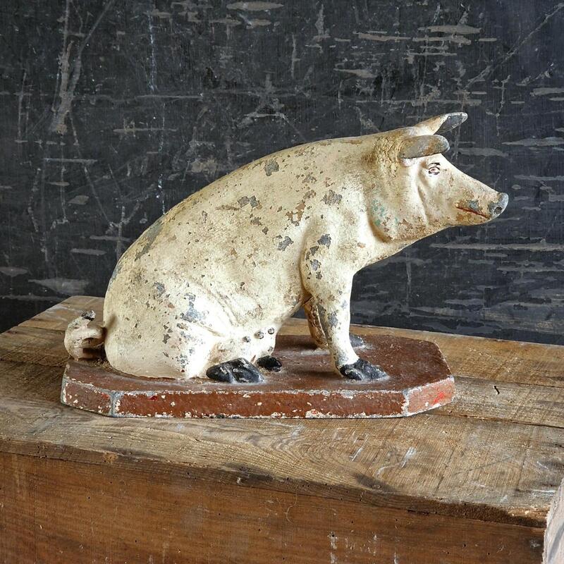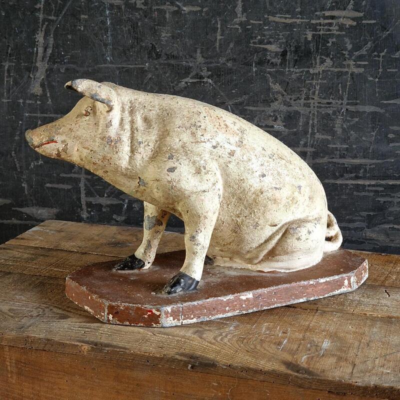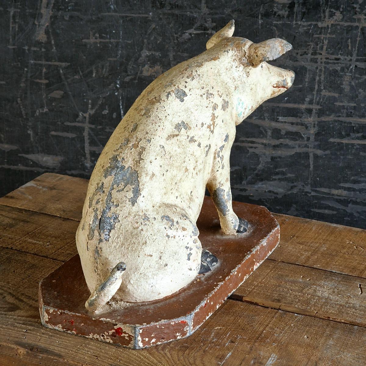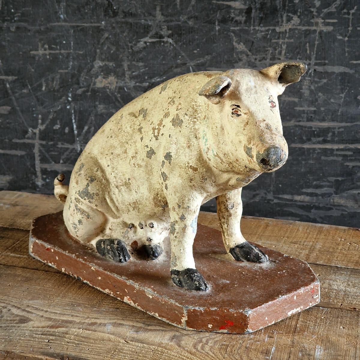 A nicely conserved and rare spelter publicty pig from a butcher's or grocary shop,with a lovely original patina with flaky paint, has old almost unvisible repair on 1 ear, France 1900