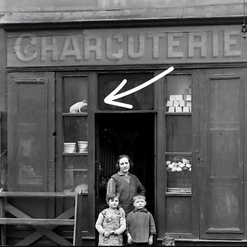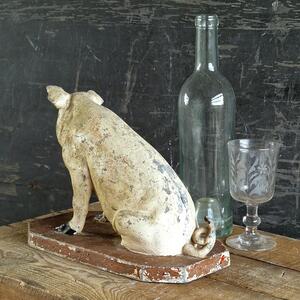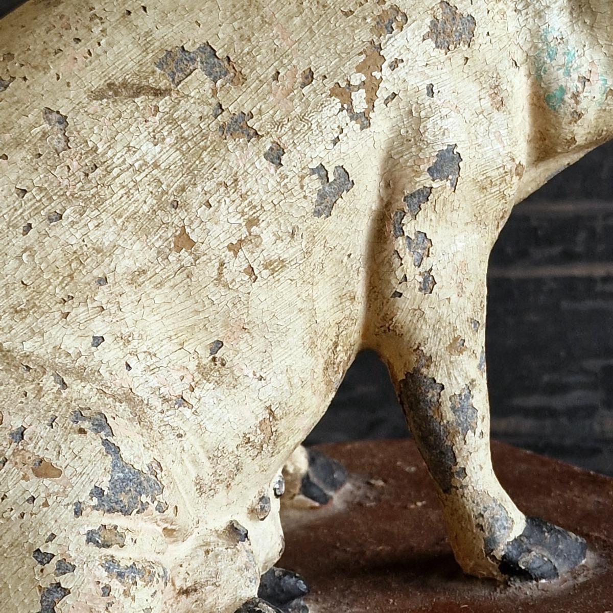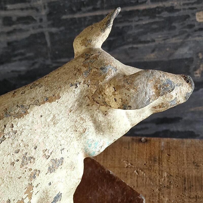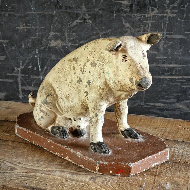 A nicely conserved and rare spelter publicty pig from a butcher's or grocary shop,with a lovely original patina with flaky paint, has old almost unvisible repair on 1 ear, France 1900