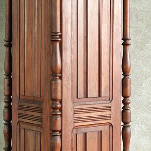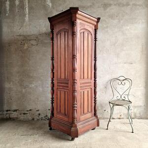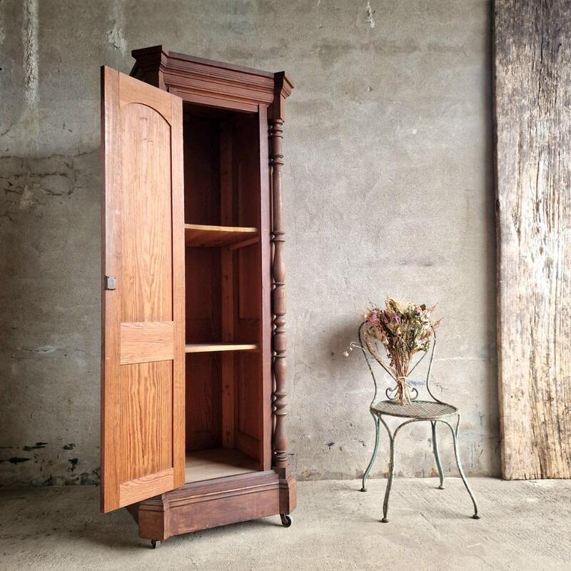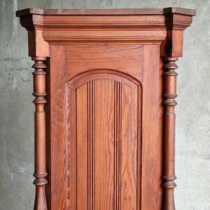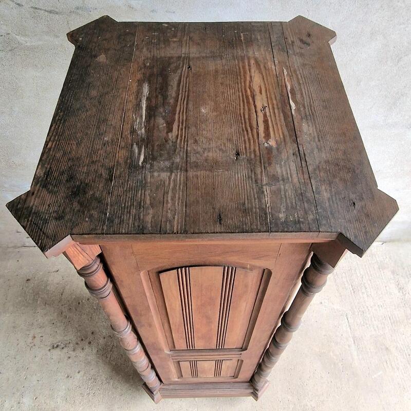An imposing high plinth with door made of pine wood, flanked by 4 thin columns at the corners, on 4 small casters, can be used as a cabinet with 2 interior shelves or as pedestal for a statue or vase, good and very sturdy quality, Belgium 1910