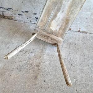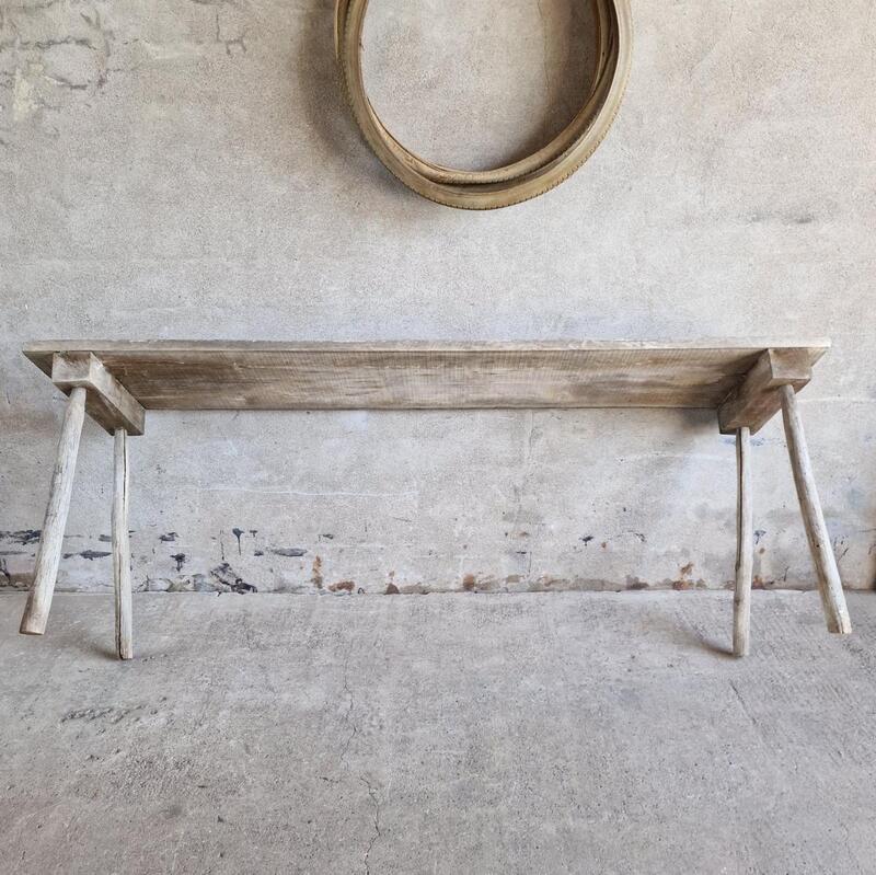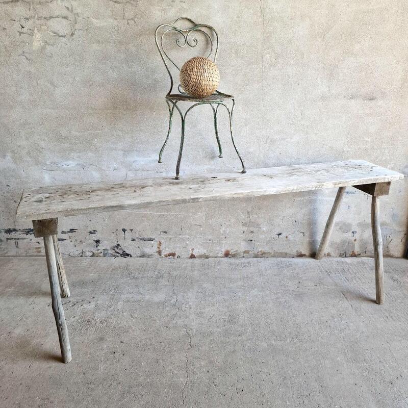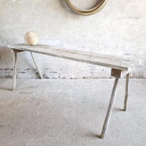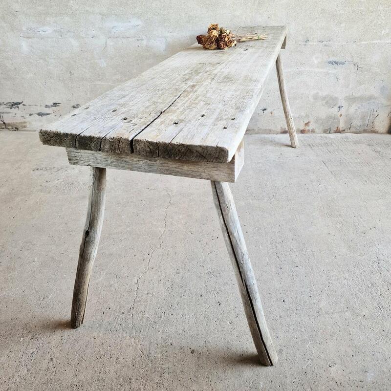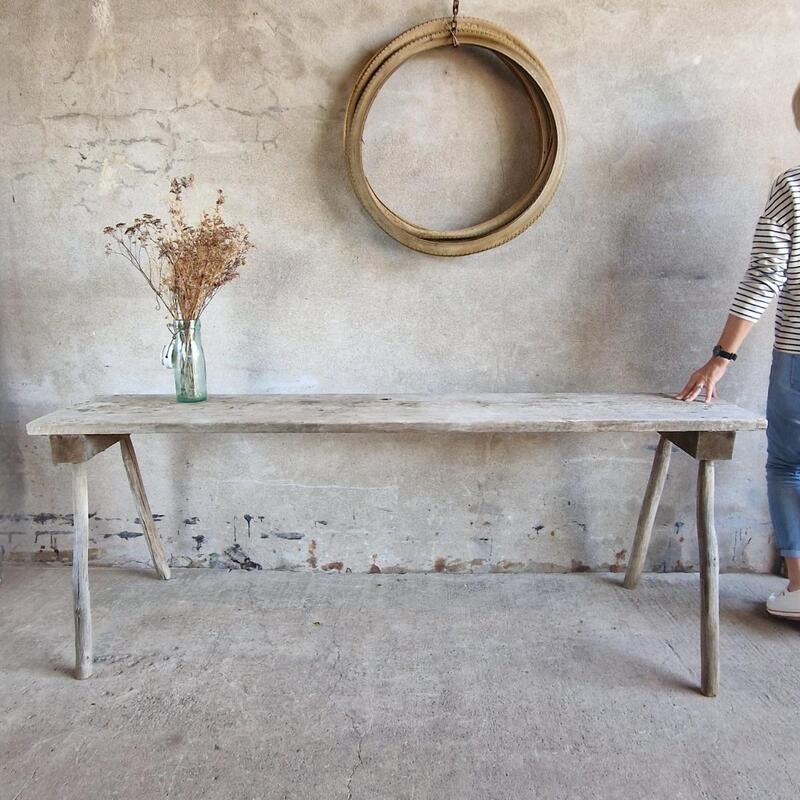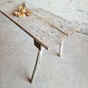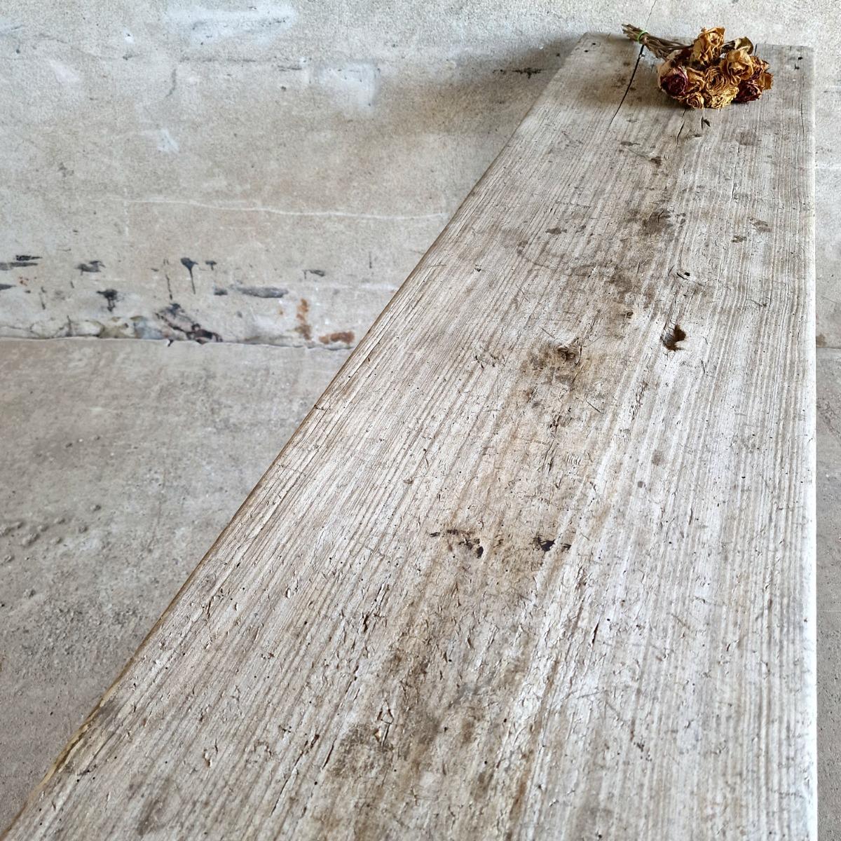 An awesome laundry console table made of wood, a used long rectangular top on 4 round irregularly shaped legs, some tiny holes in top, beautiful dry patina, good stable condition, France 1900