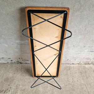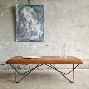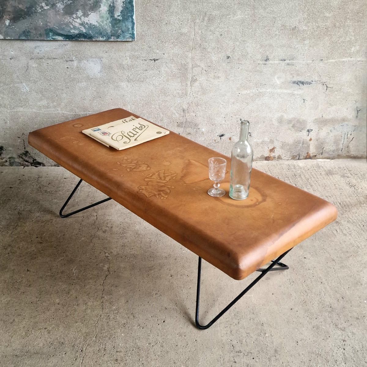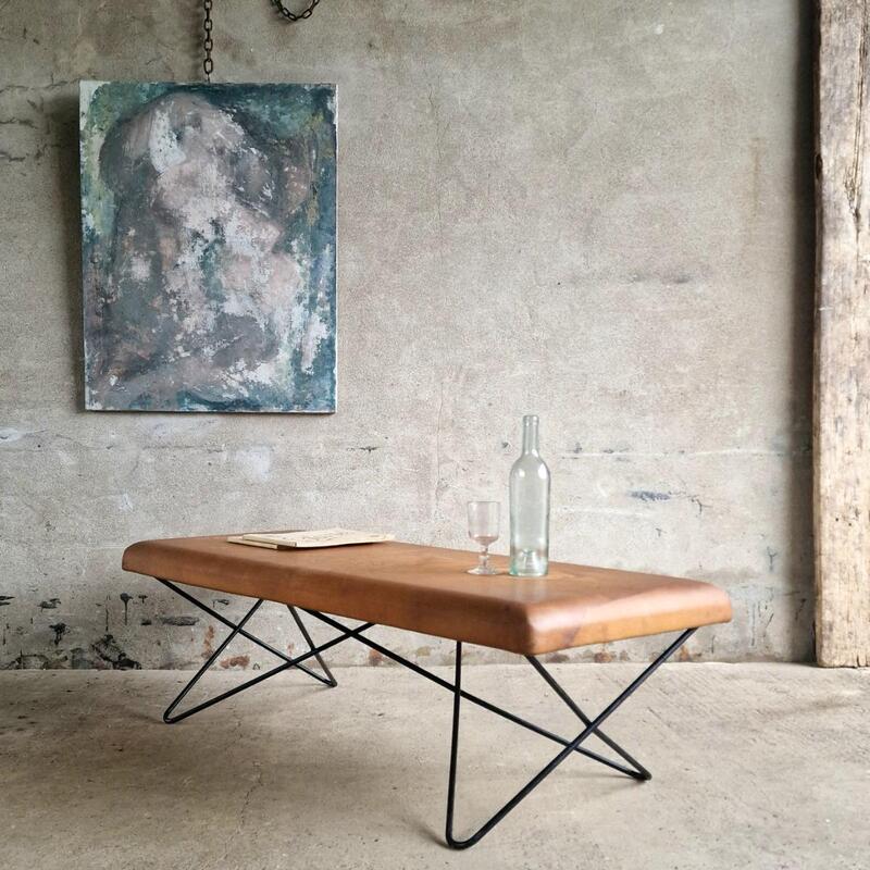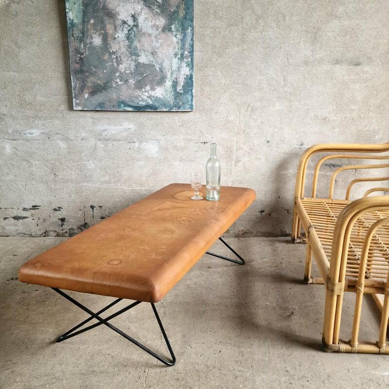 A smart leather bench or coffee table made of an old leather top mounted on a bespoke black painted metal base, leather has some stains adding  to the charm, in overall good and stable condition, no cracks nor rips, last available piece, Belgium 1950