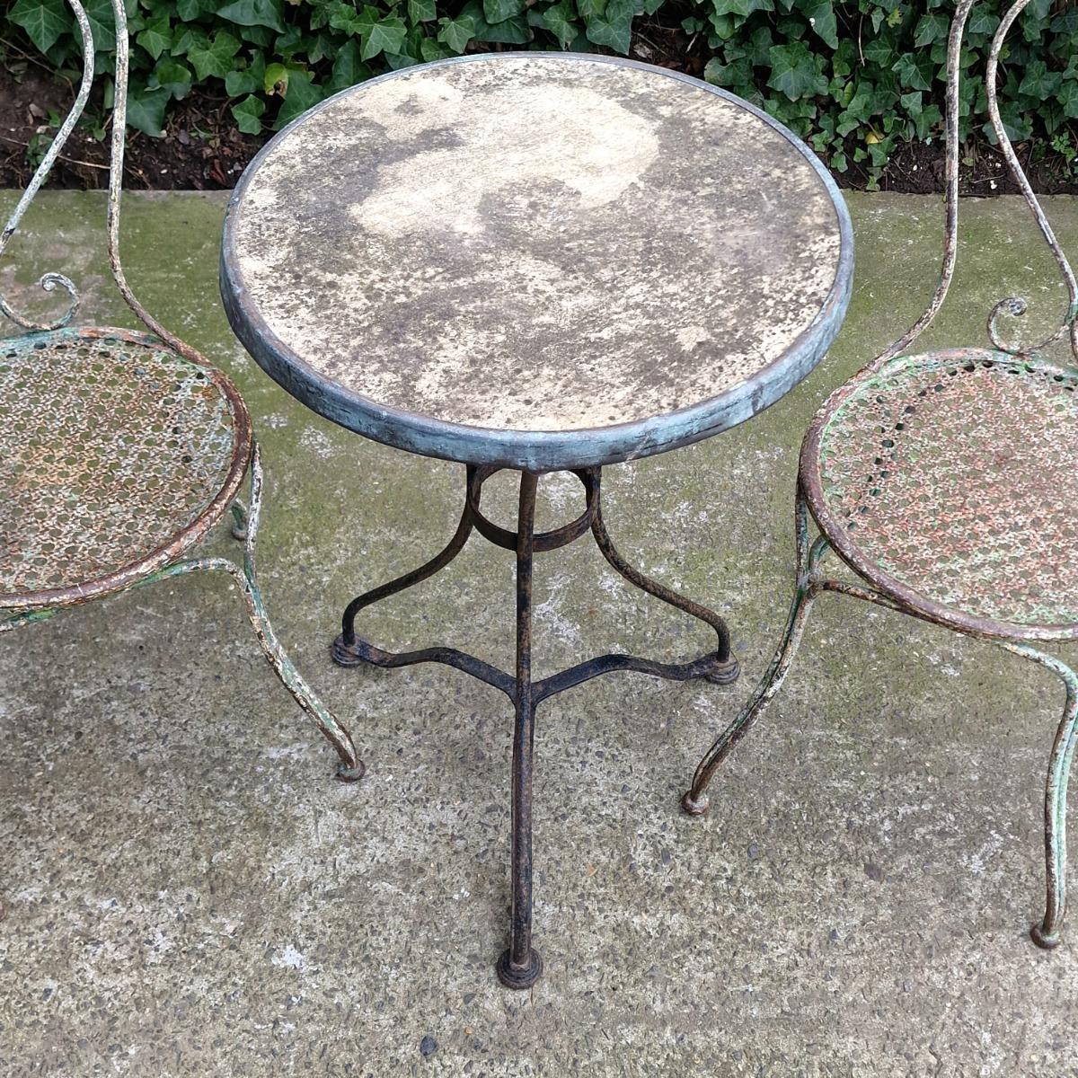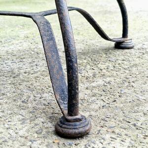 A classy small garden table made of a cast iron base and thick round copper-rimmed marble top, watch the special pastille table feet, lovely weathered top and base, very good and stable condition, France 1880