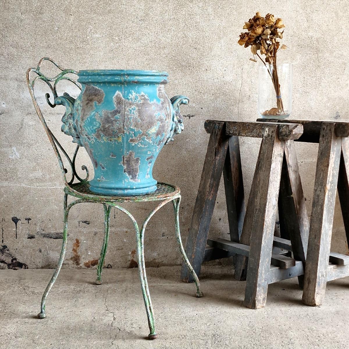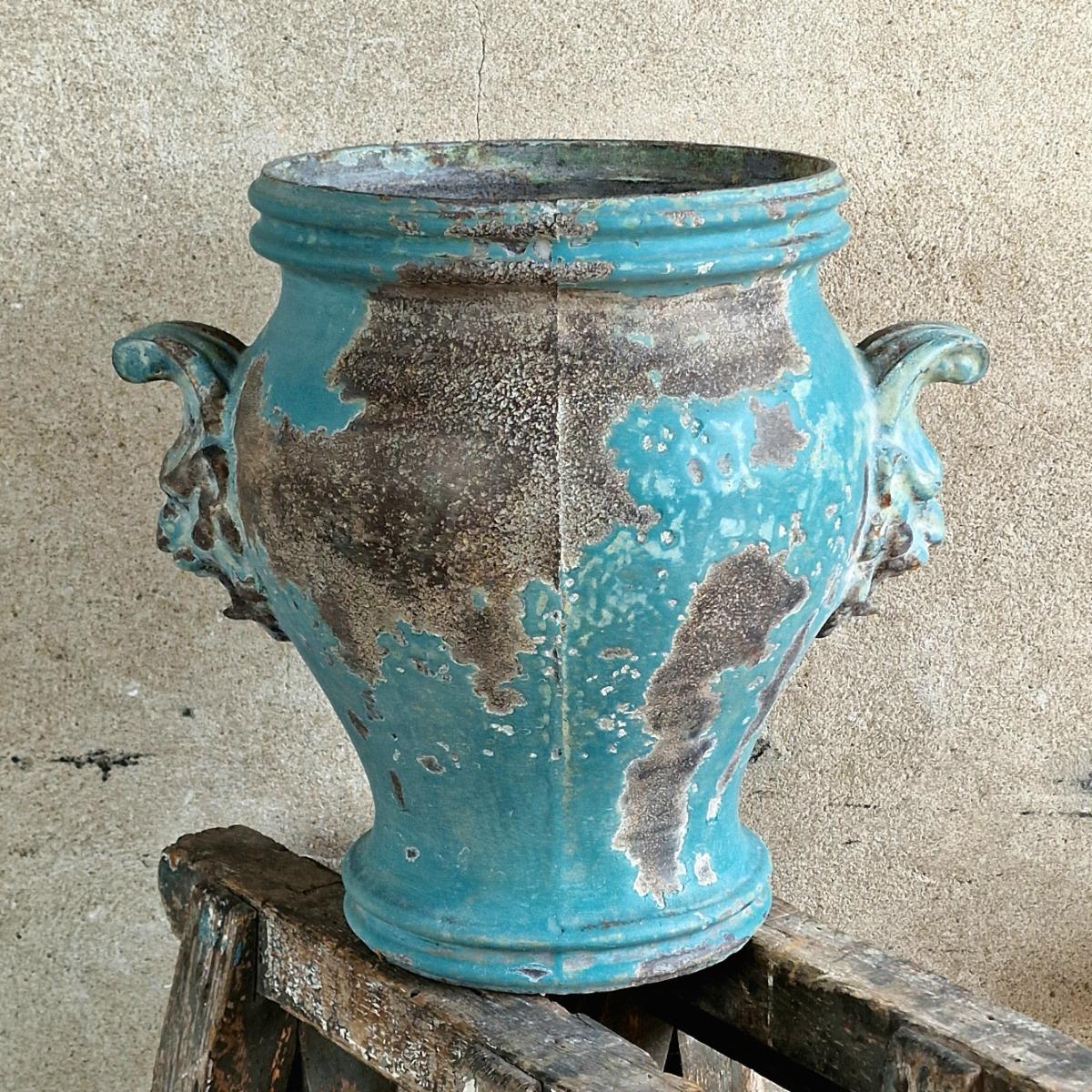 A ravishing rare19thC blue Rouen urn made of cast iron with 2 lion head handles, founder's label inside "C. Paris", partially stripped blue enamel that makes you think of a world map, good weathered condition, France 1880