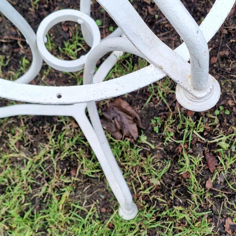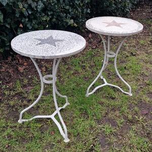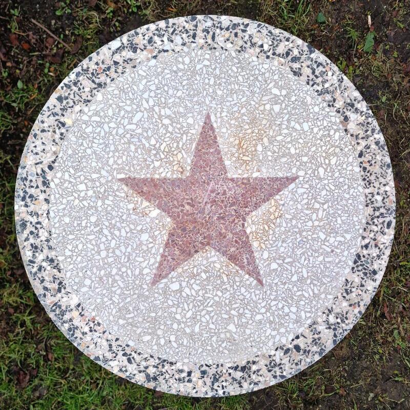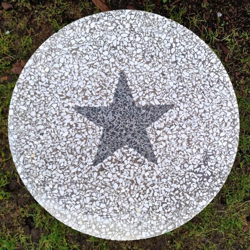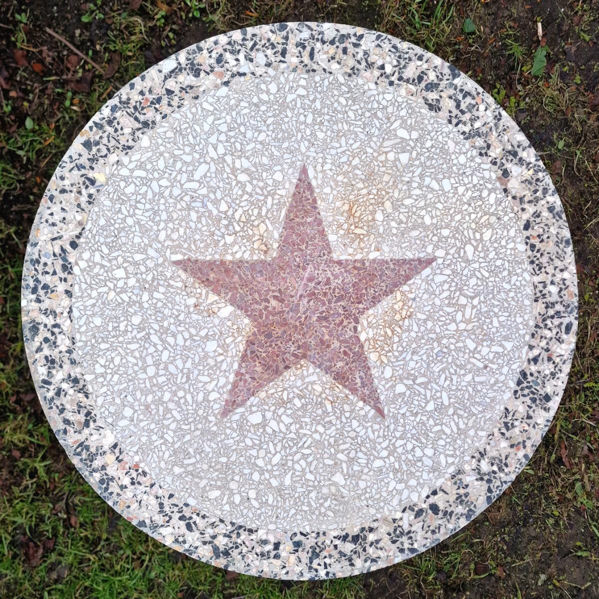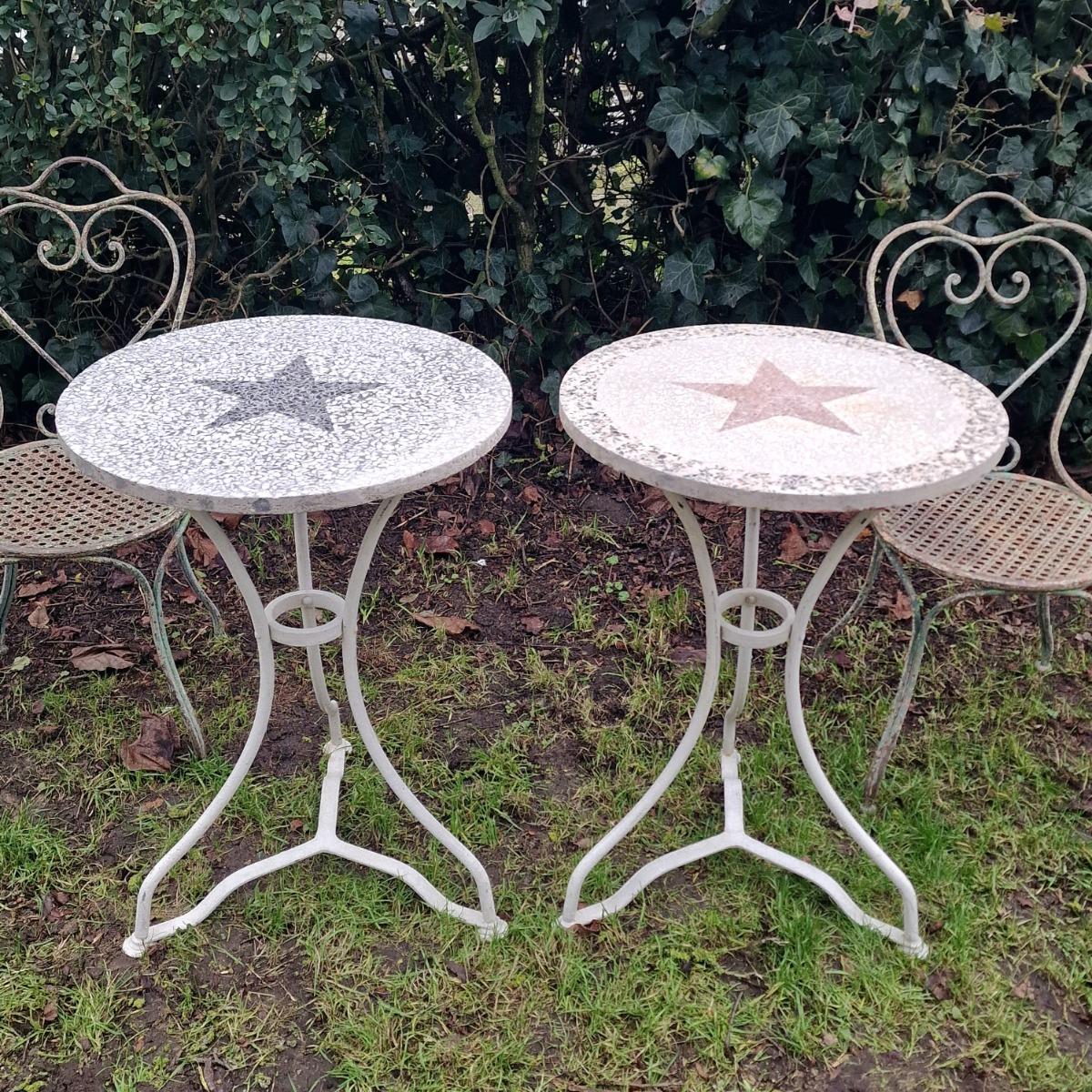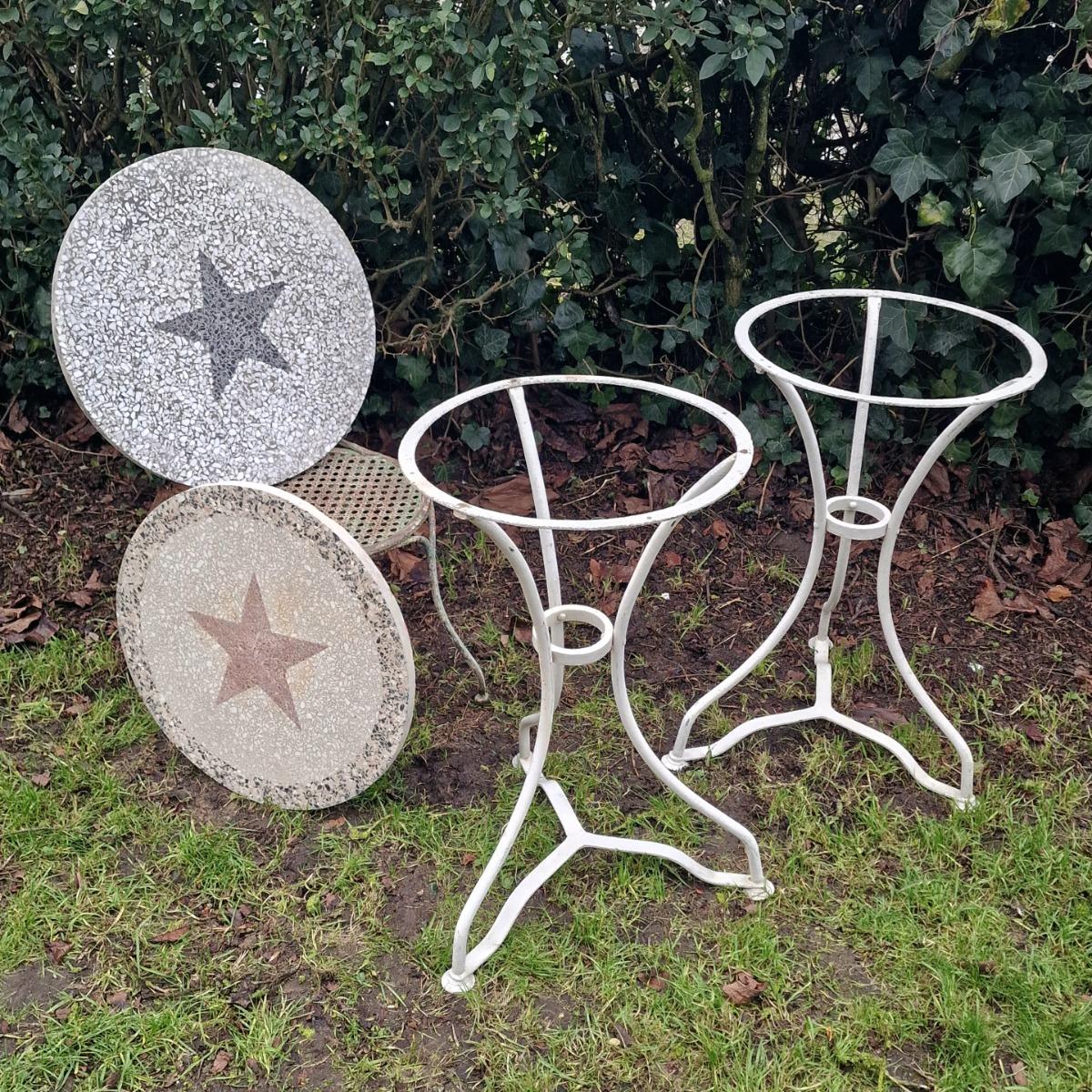 A good-looking set of 2 side tables made of a white painted metal tripod base and a round terrazzo top, each top is decorated with a red or grey star, not yet attached as easier for transport, France 1950