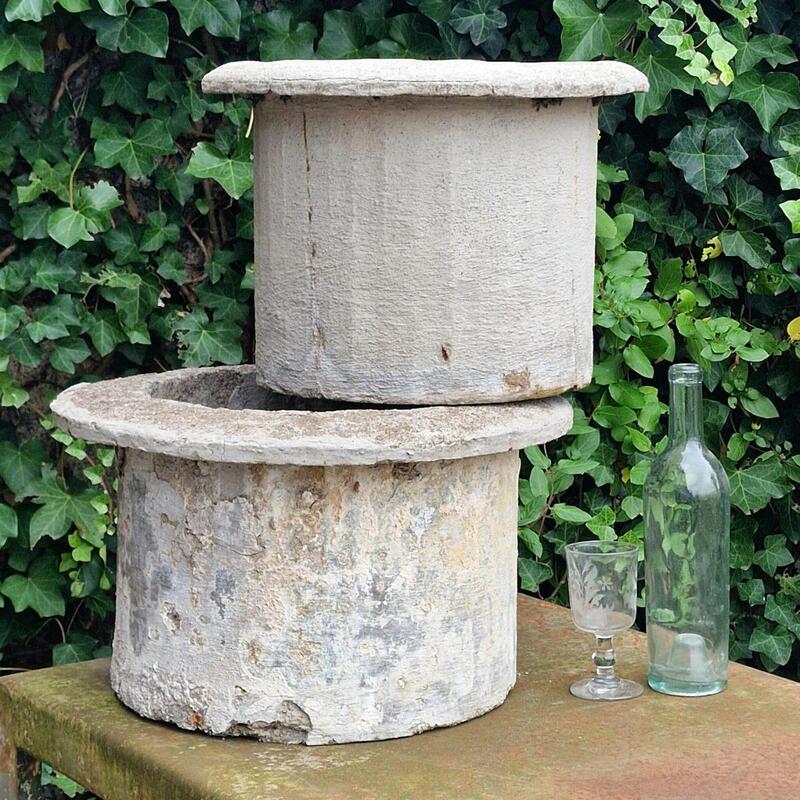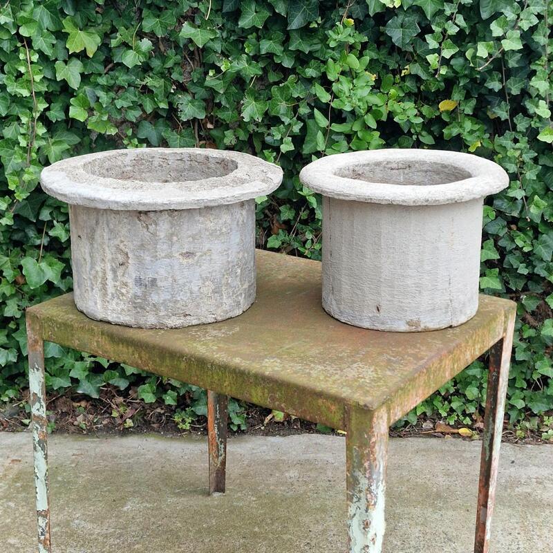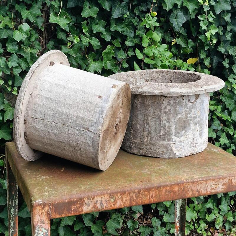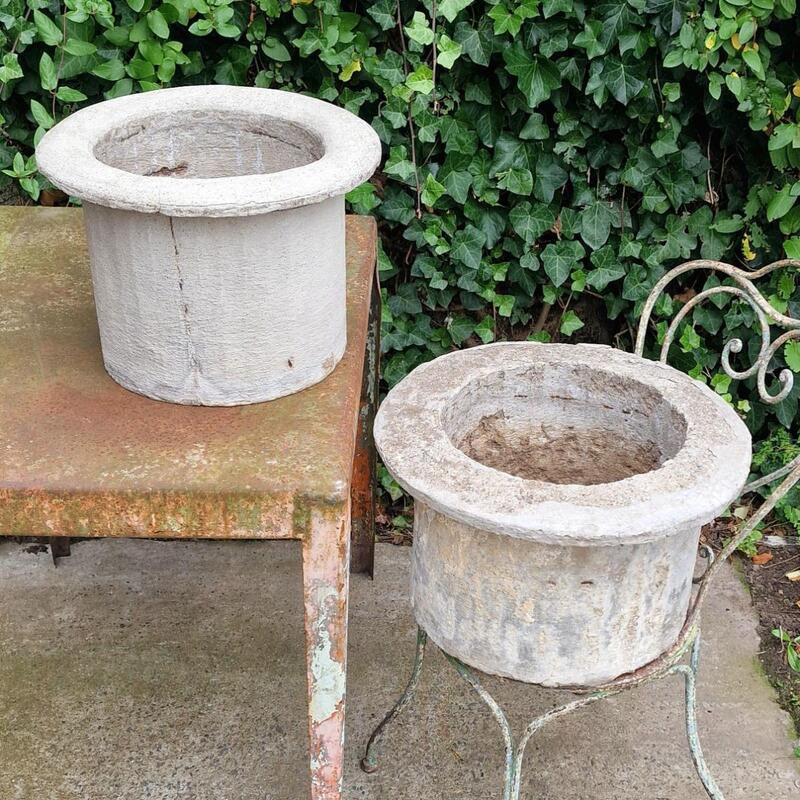 An unusual set of 2 'tube hat' planters made of cast stone, different in size, one in more weathered white paint than the other, drainage hole, good used condtion with some chips and old cracks, France 1950