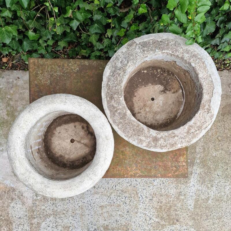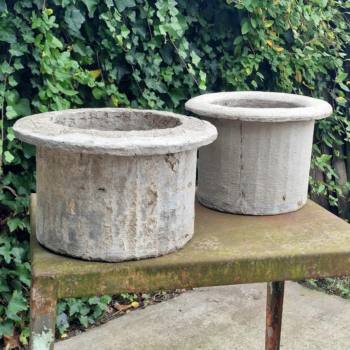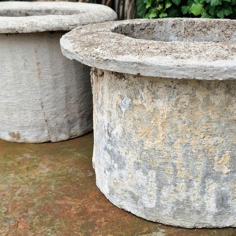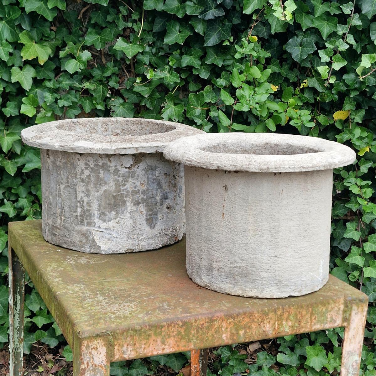 An unusual set of 2 'tube hat' planters made of cast stone, different in size, one in more weathered white paint than the other, drainage hole, good used condtion with some chips and old cracks, France 1950