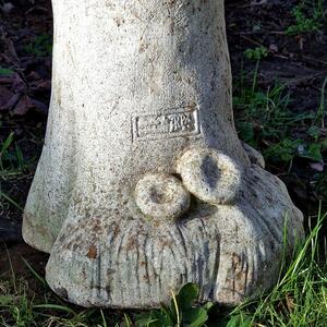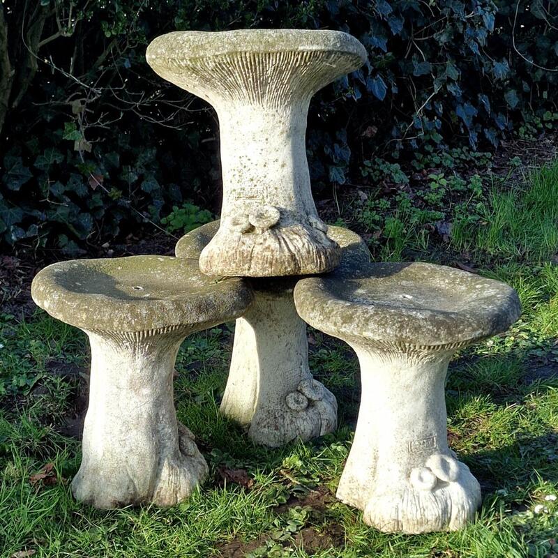 A delightful set of 4 mushroom stools with weathered white cast stone surface, with small floral decoration on bottom, with drainage hole, very good stable condition, France 1970s