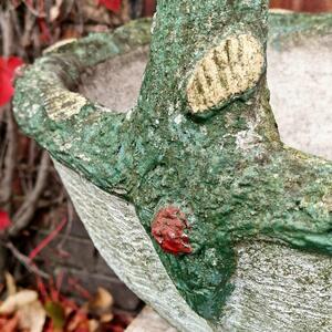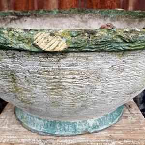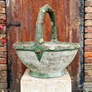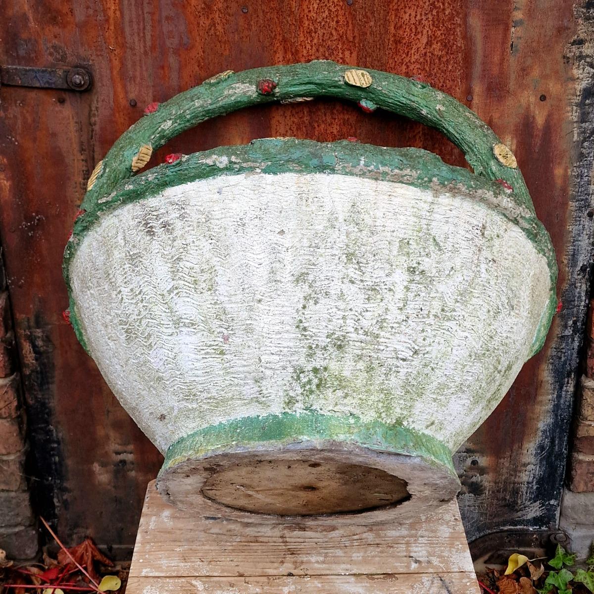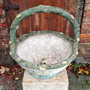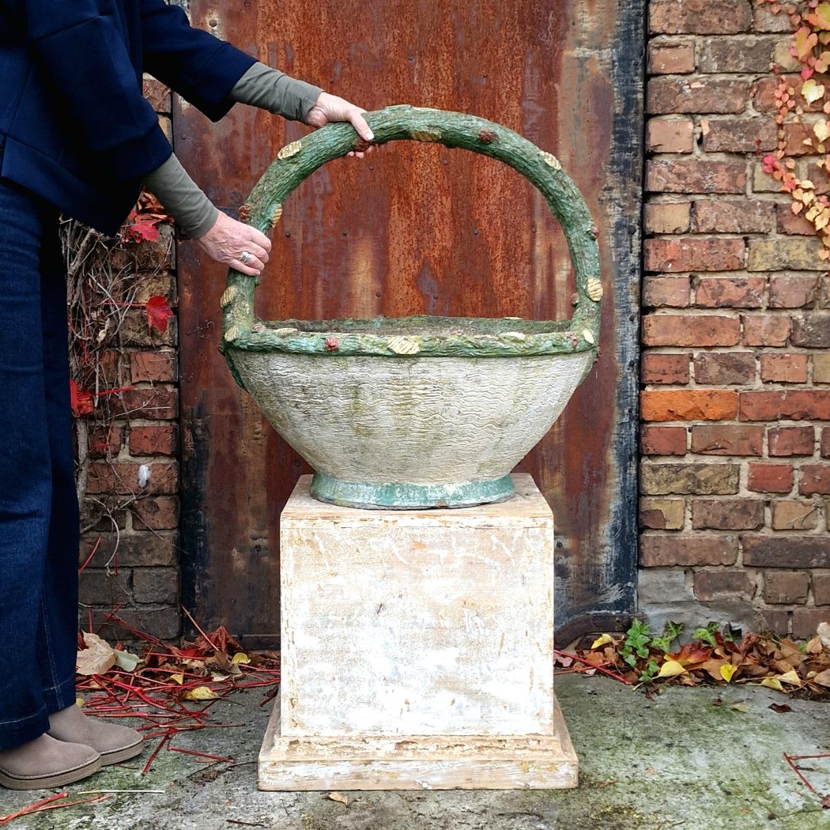 An enchanting faux bois basket planter made of cast stone, weathered white and green paint with lovely details, good condition with some old minor cracks, France 1950
