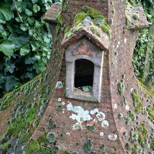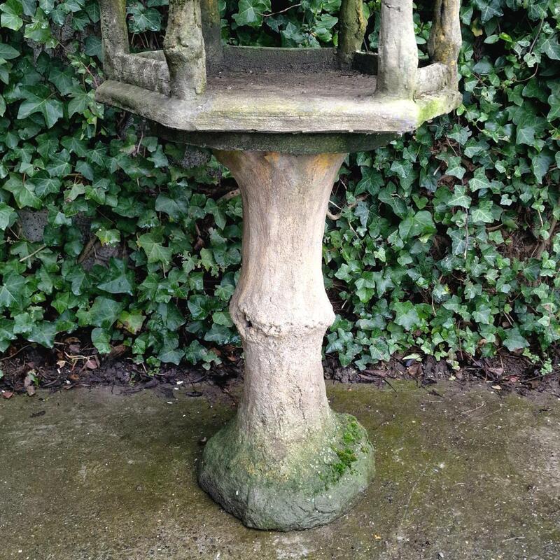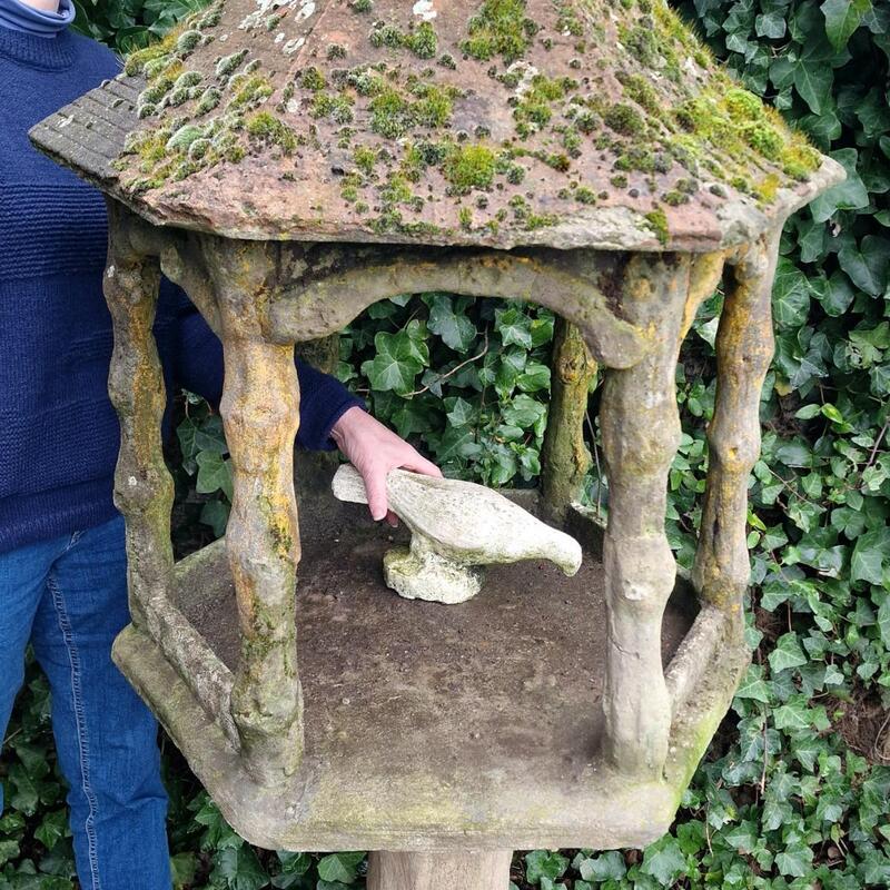 A gorgeous and large faux-bois bird feeder in a hexagonal shape made of cast stone, has stunning pointed roof with 3 roof windows and lovely detailed tiles, superbly weathered with layers of moss, some old small chips, in 2 parts for transport, Belgium 1940