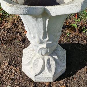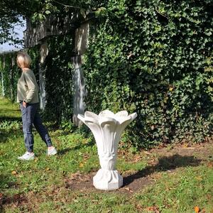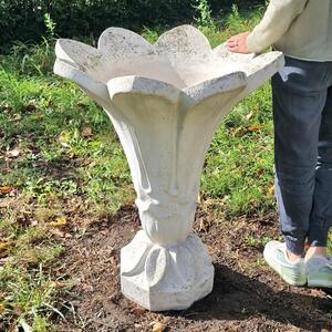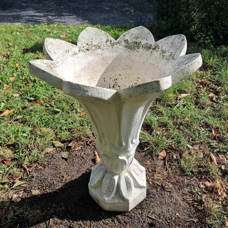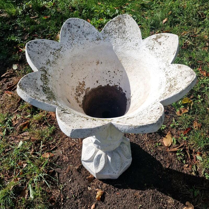 A charming and elegant flower shaped planter made of cast stone, slightly weathered thick white paint, drainage hole, stable model in very good condition, Belgium 1960