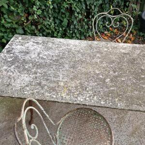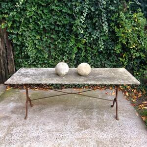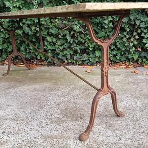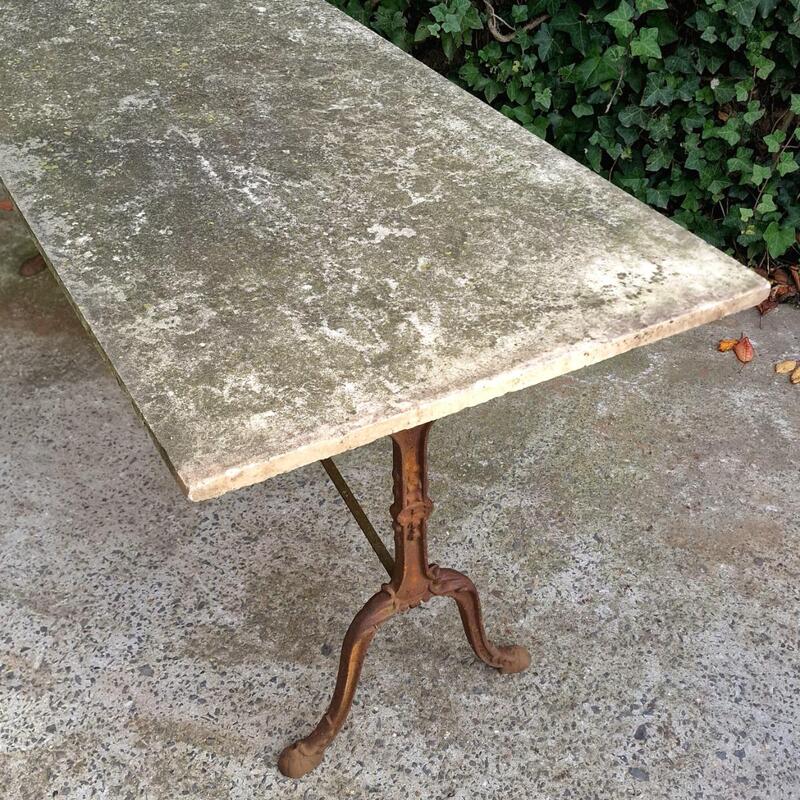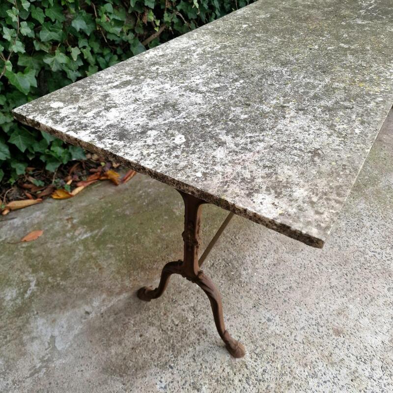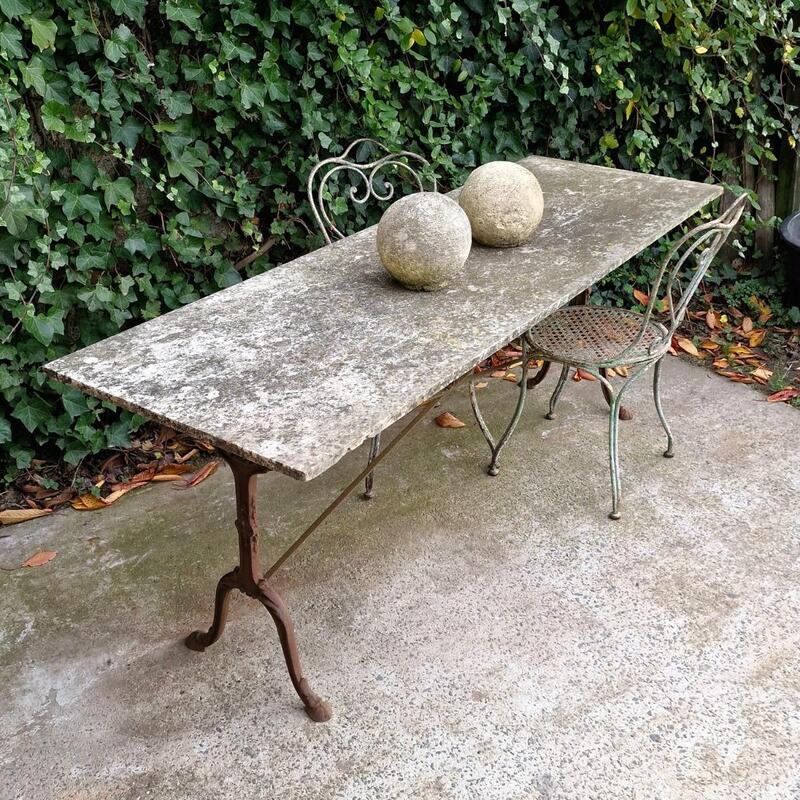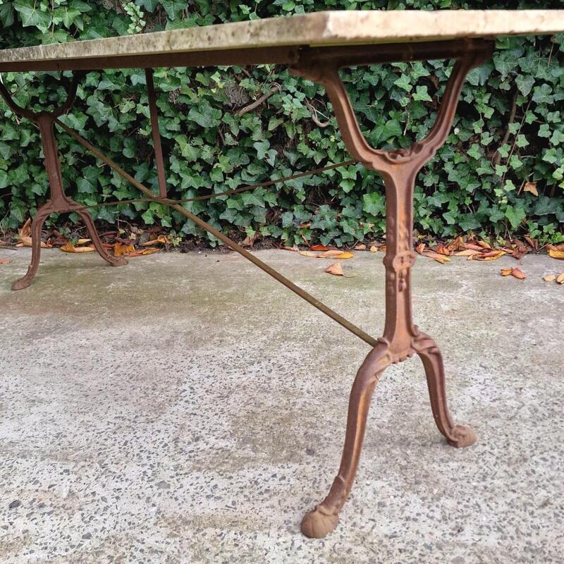 A larger than usual practical large garden table to receive your friends and family, sits 8 persons to drink a glass (or 3), metal cast iron base with nicely weathered faux-marble top, some chips from top but adding to the charm, France 1960