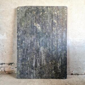 A stunning mid 20thC slate table consisting of a rectangular top and a 2-piece crossed base, top has 2 sides: rough and smooth, signed and dated by the maker, one corner was recut long time ago, good condition with some chips, France 1950