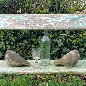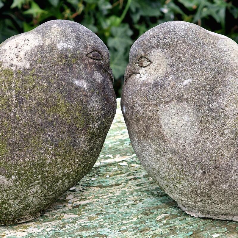A wonderful pair of cast stone pigeons in a bloaty naive style, with a pleasing weathered patina, very good condition, France 1980