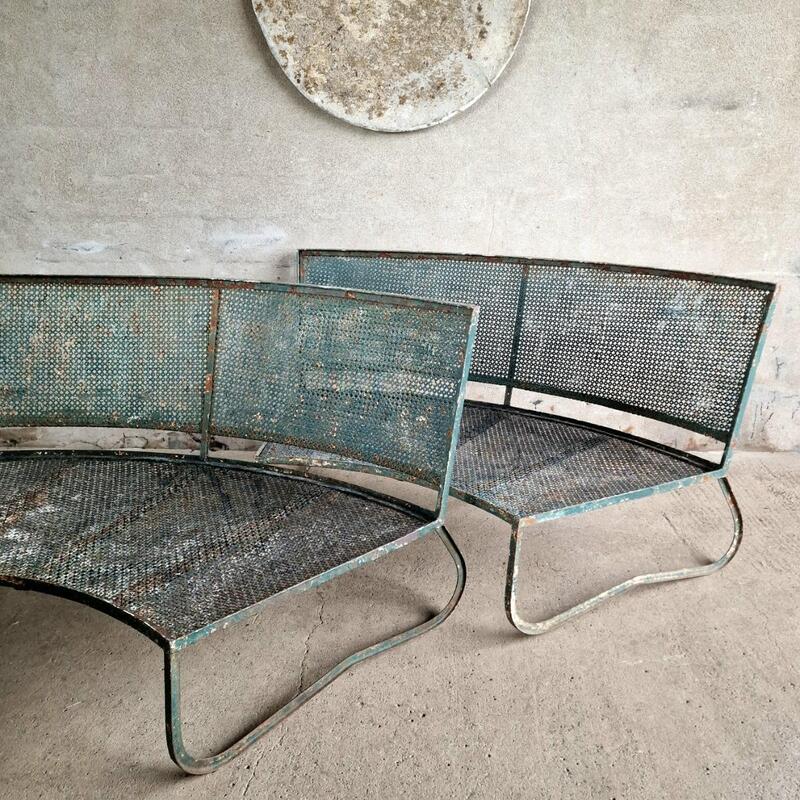 An fashionable pair of curved garden benches made of perforated metal in the Mategot style, weathered dark green paint, good condition with 3 handcrafted restorations in the seat and backside, but hardly visible (see last picture), France 1960