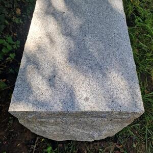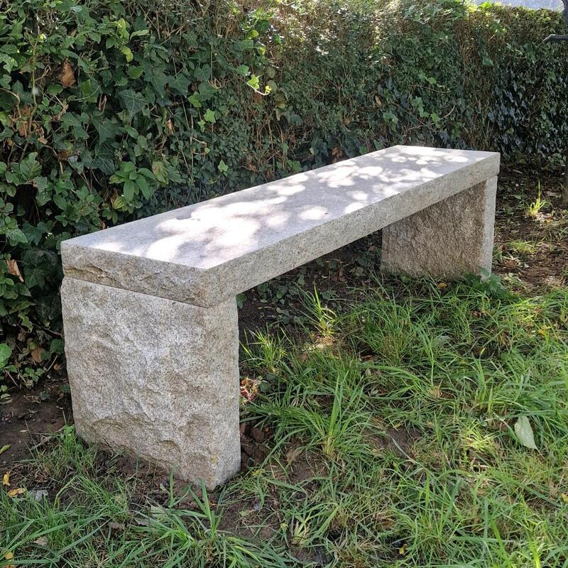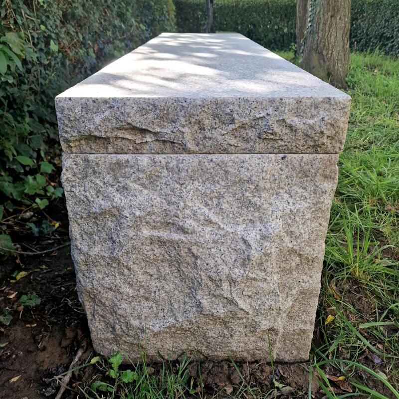 A fantastic primitive stone bench consisting of 3 thick light grey hand-carved granite parts, the feet can be put differently as they are not attached, slightly weathered patina, very good condition, Belgum 1 million years old but made in the 70ties