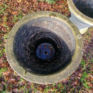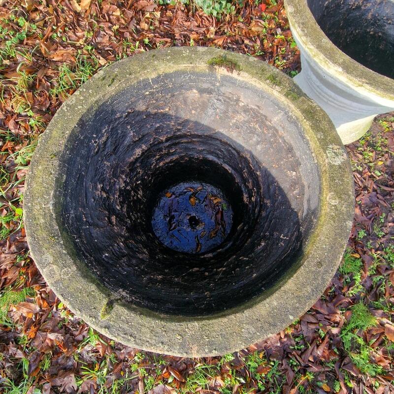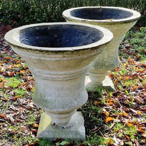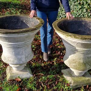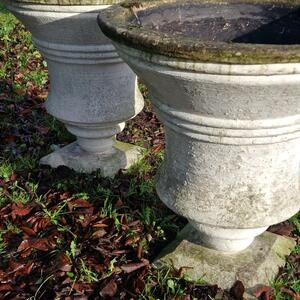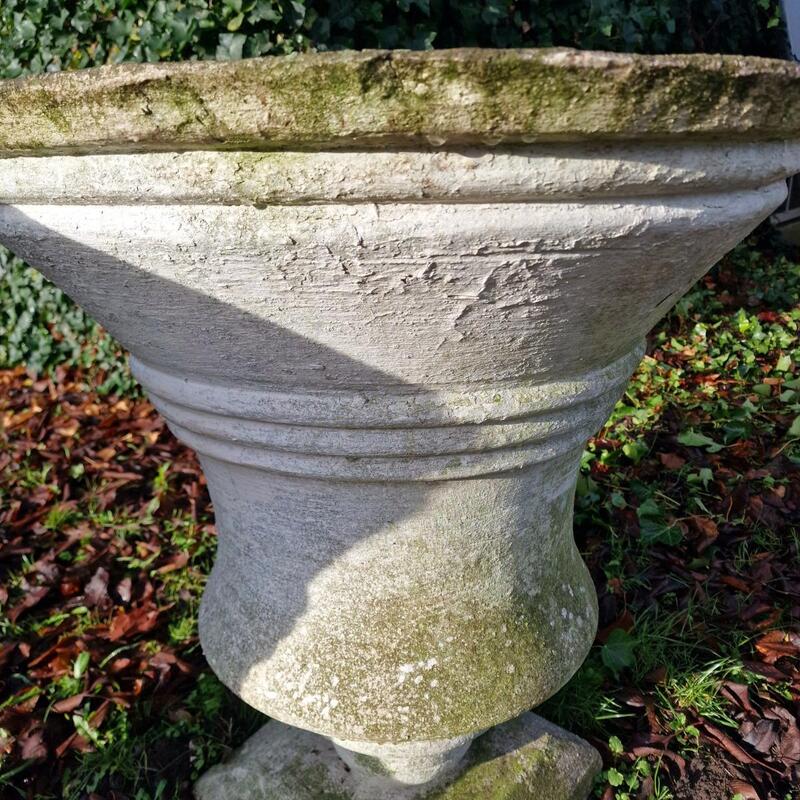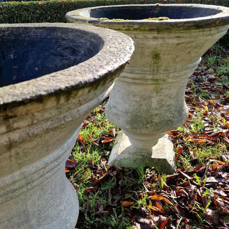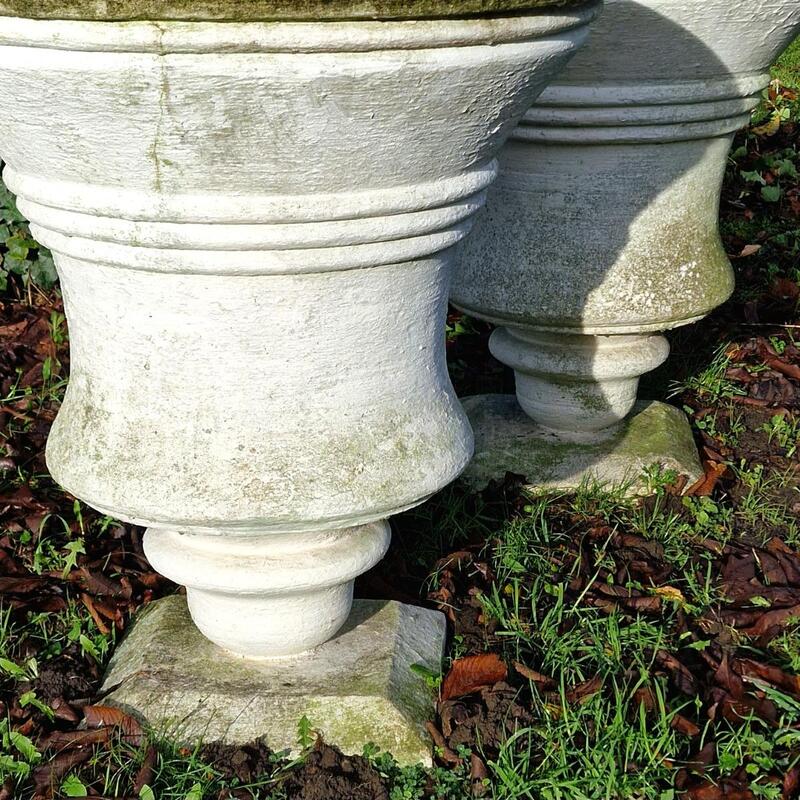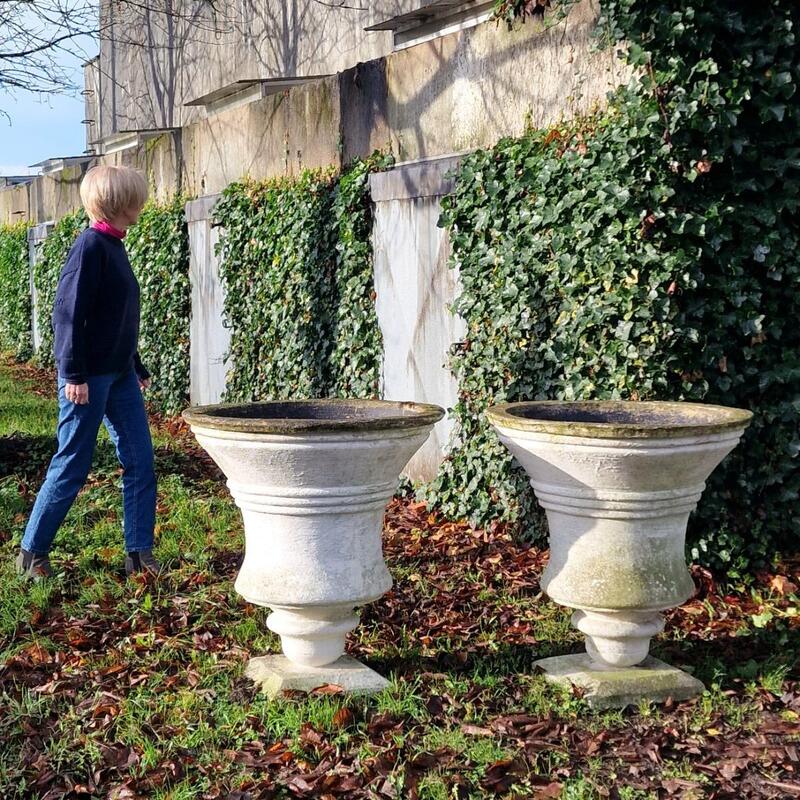 A stunning XL pair of garden urns made of cast stone in an attractive elegant shape, lovely weathered patina on white painted surface, good and sturdy condition with some usual cracks, Belgium 1930