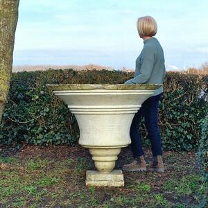 A gorgeous XXL cast stone planter in a trumpet shape on special base, enchanting weathered patina on rim and white painted surface, good condition with small cracks and chip from base, Belgium 1950