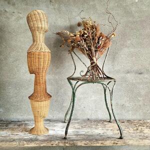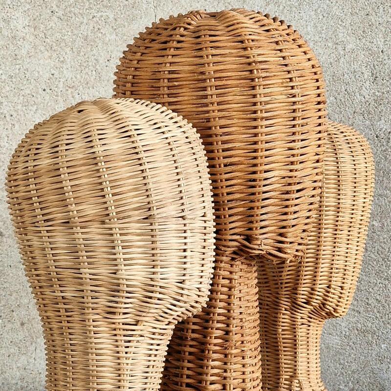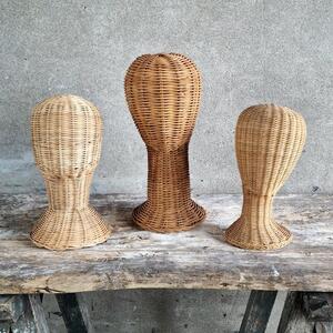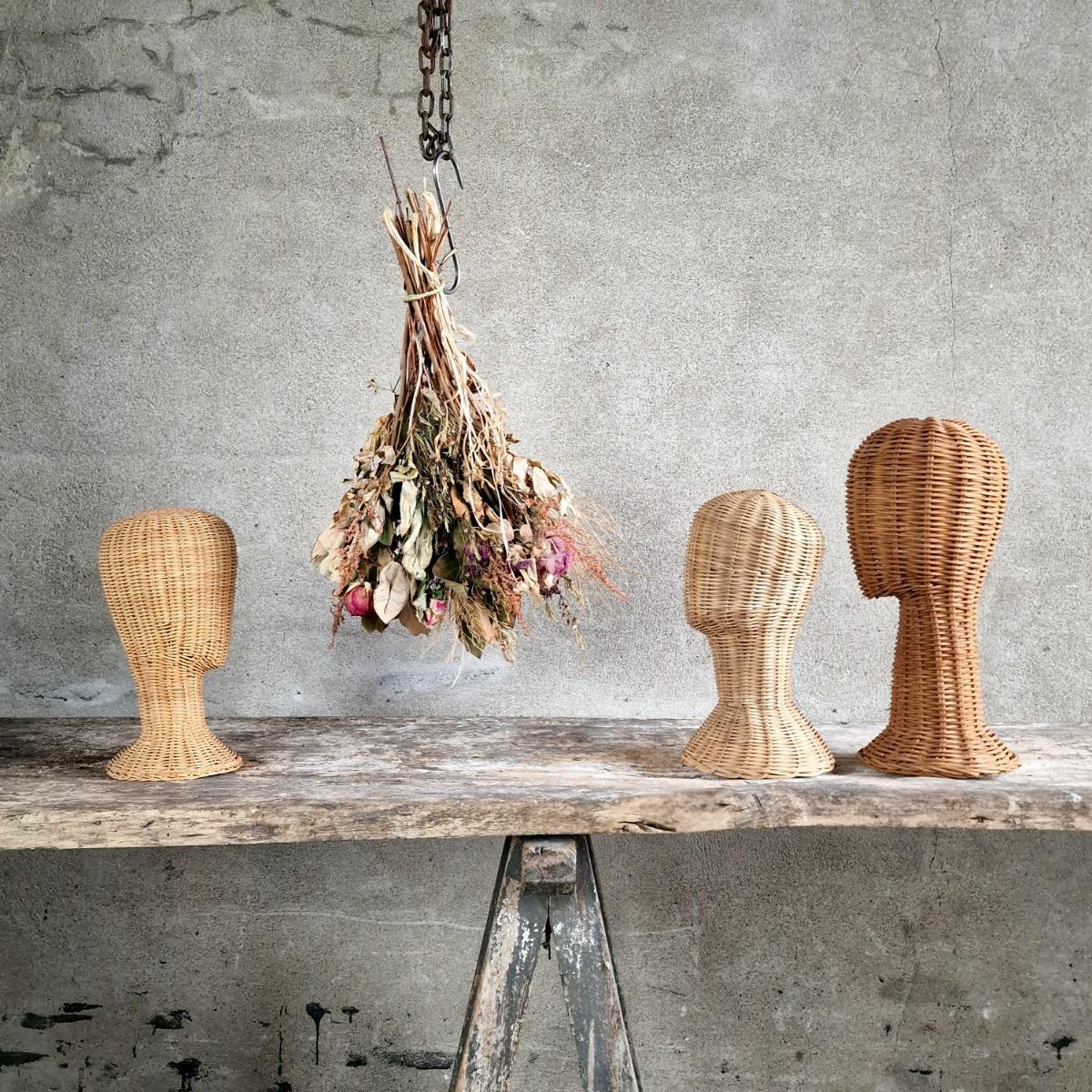 An amusing and attractive collection of 3 wicker heads to store your hats or fancy pink wig in a decorative way, less common thick woven rattan, very good condition, France 1970