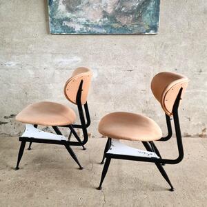 An exceptional pair of 60ties easy chairs with black metal structure, prototype?, very comfortable chairs in a quirky style, sits lower than usual, good condition, probably Italy 1960