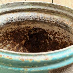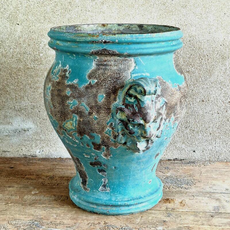 A ravishing rare19thC blue Rouen urn made of cast iron with 2 lion head handles, founder's label inside "C. Paris", partially stripped blue enamel that makes you think of a world map, good weathered condition, France 1880