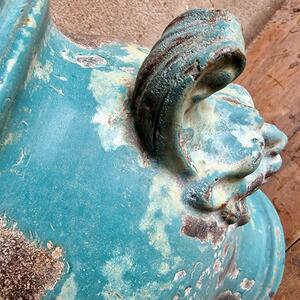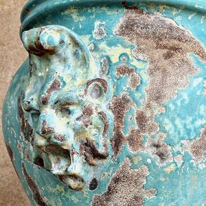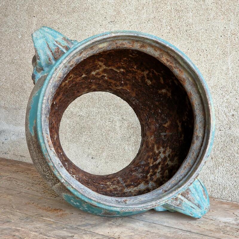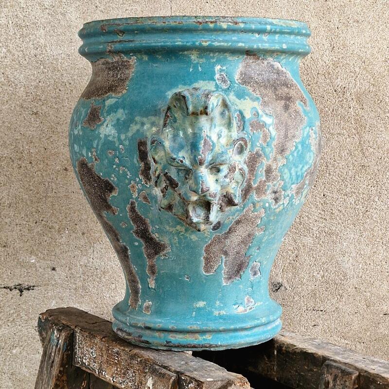 A ravishing rare19thC blue Rouen urn made of cast iron with 2 lion head handles, founder's label inside "C. Paris", partially stripped blue enamel that makes you think of a world map, good weathered condition, France 1880