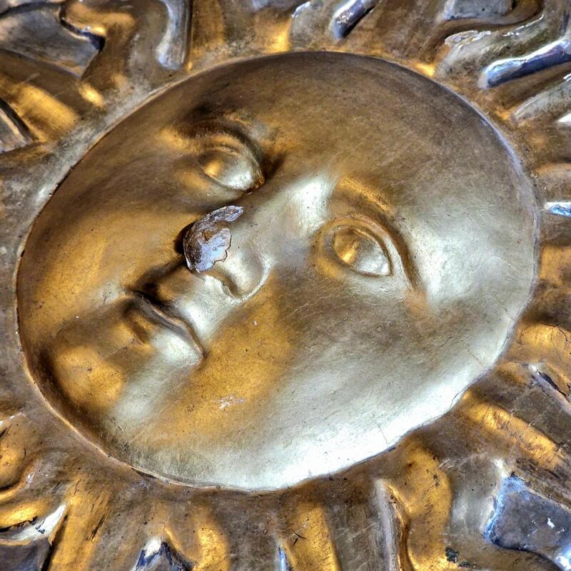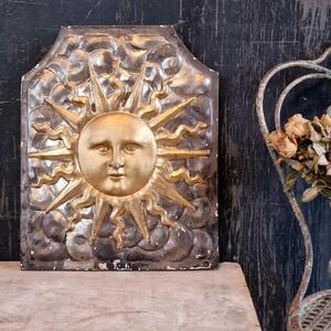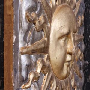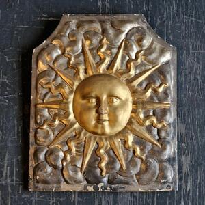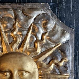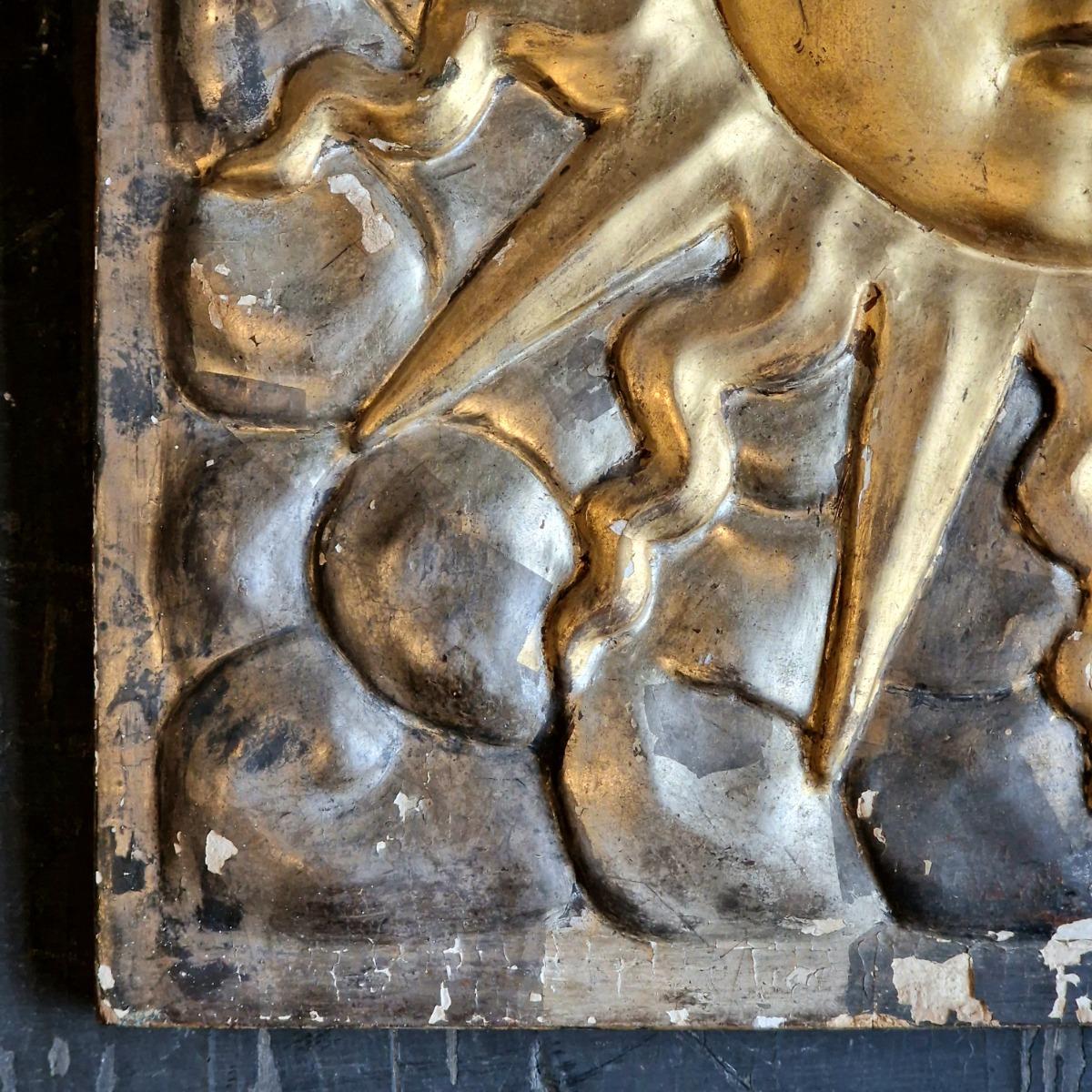 A very well preserved wooden pannel depicting the sun, very nice surface with nice patination, with sunbeams and clouds giving the total a visible dept, some chips from nose but not harming, France 1850