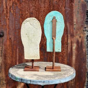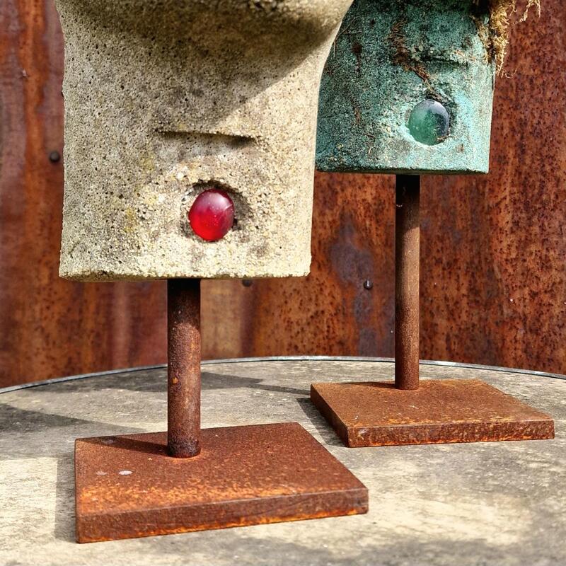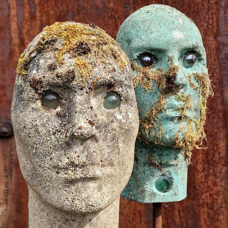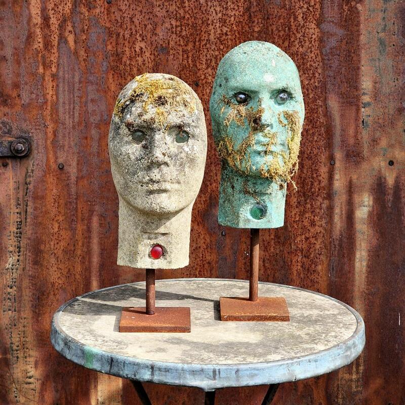 An enchanting set of 2 cast stone heads mounted on bespoke metal stands in different heights, decorated with green glass eyes, great weathered surface with some moss, very good condition, France 1970