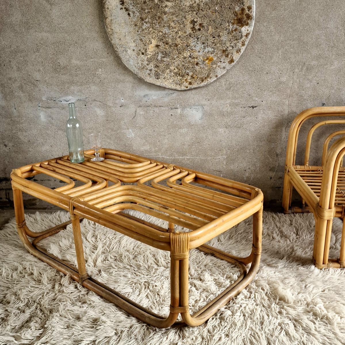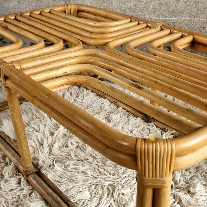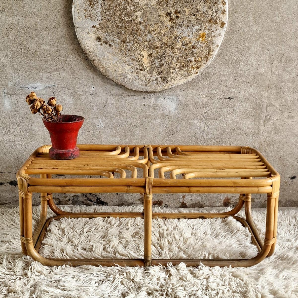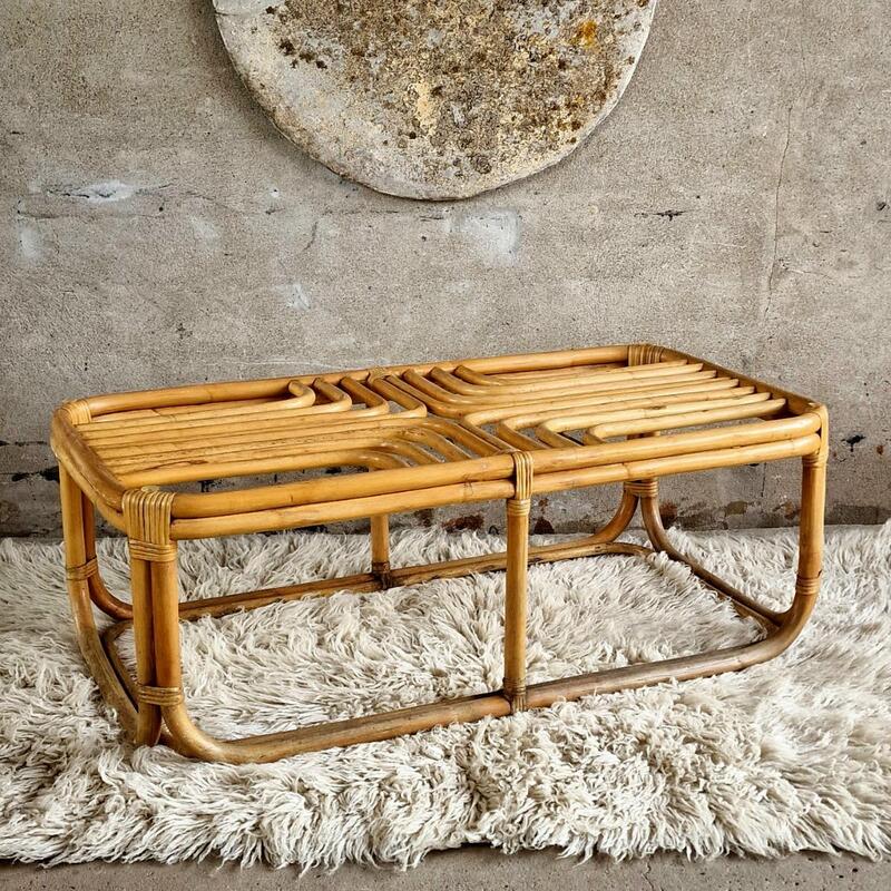 A trendy bamboo coffee table in a rectangular shape with rounded corners designed in a liniar look, you could add a glass top as supports are there (easy to remove), very good stable condition, France 1960