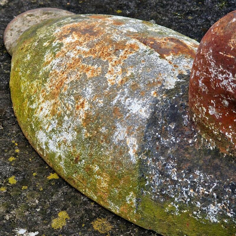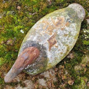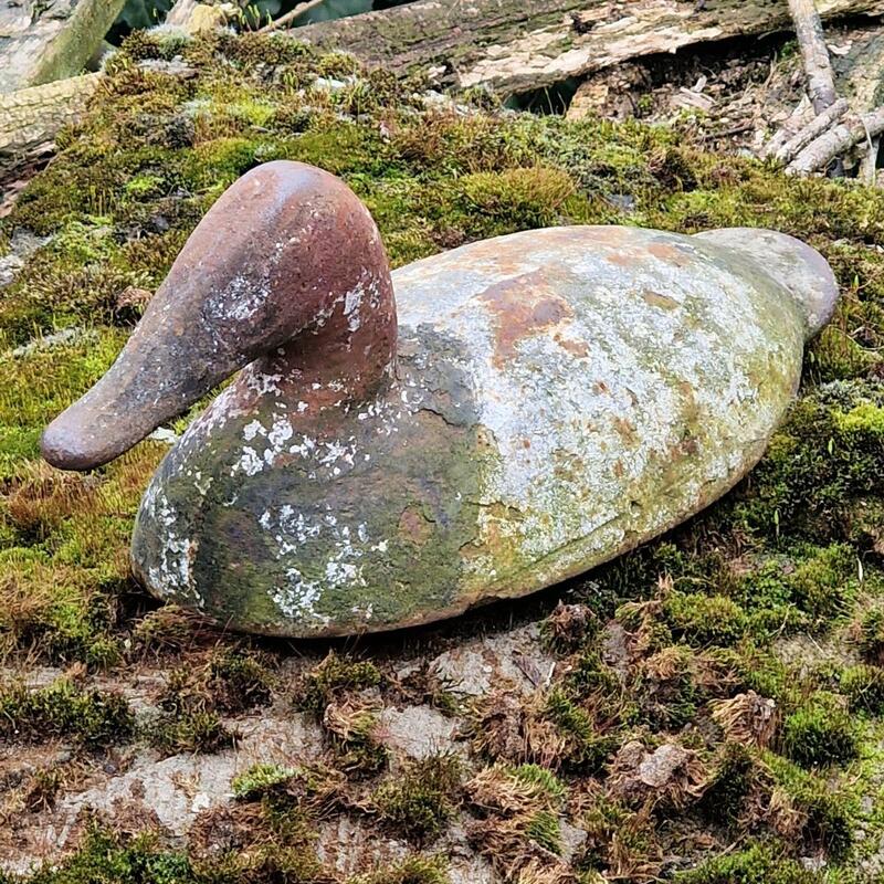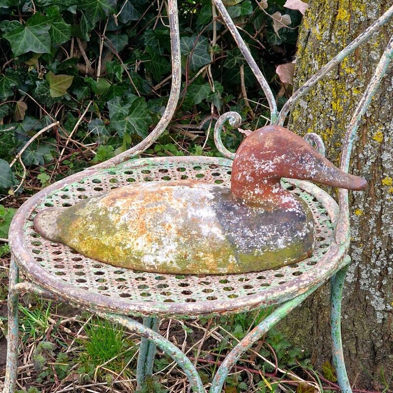 A delightful cast iron duck probably used as a decoy, adorable weathered old paint with some rusty parts, could also be used as a doorstop, perfect condition, France 1950