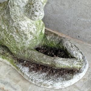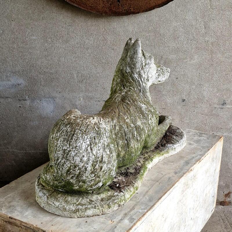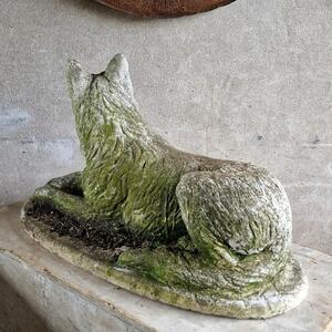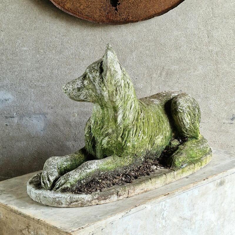 An adorable and rather large cast stone dog sculpture in a recumbent pose, dreaming greenish weathered patina, very good condition, Belgium 1970