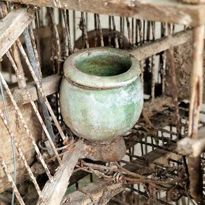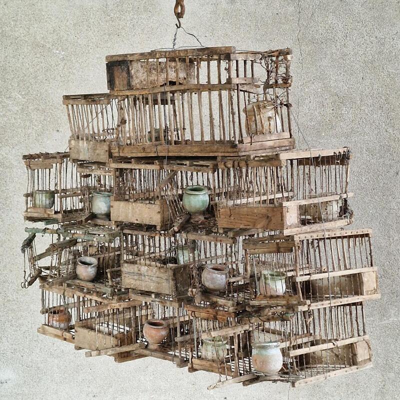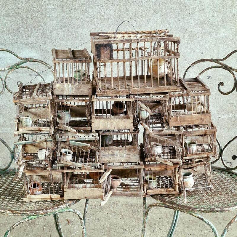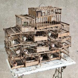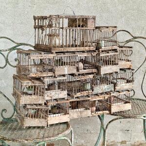 A never-seen charming composition of 17 birdcages made of wood and fine metal bars held together with wire, most cages have a very rare old terra cotta drinking bowl, very used condition so need to stay together, France 1920