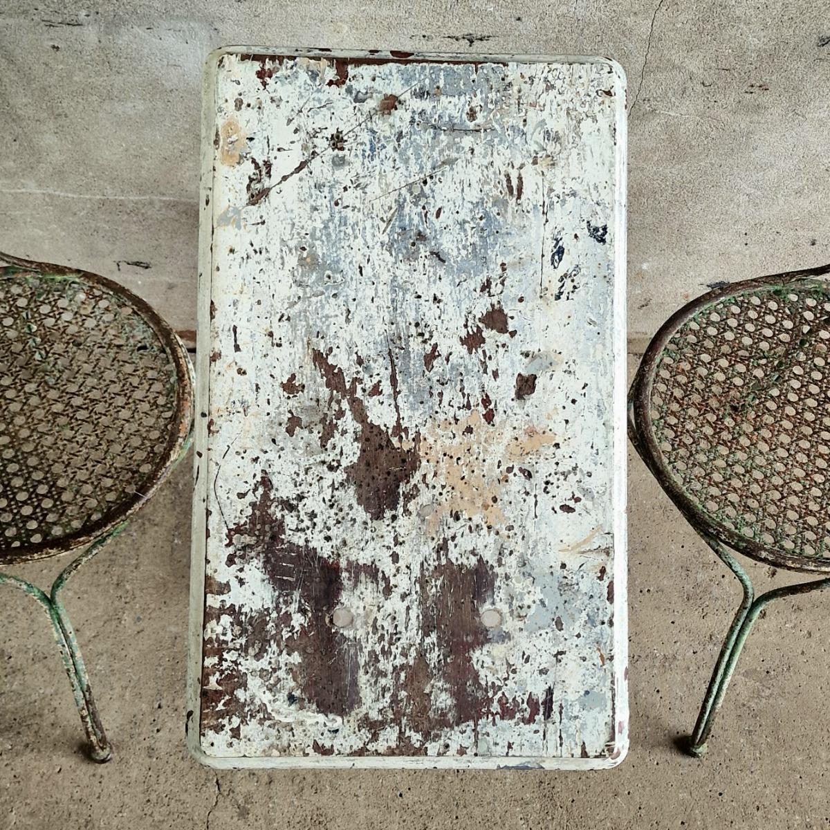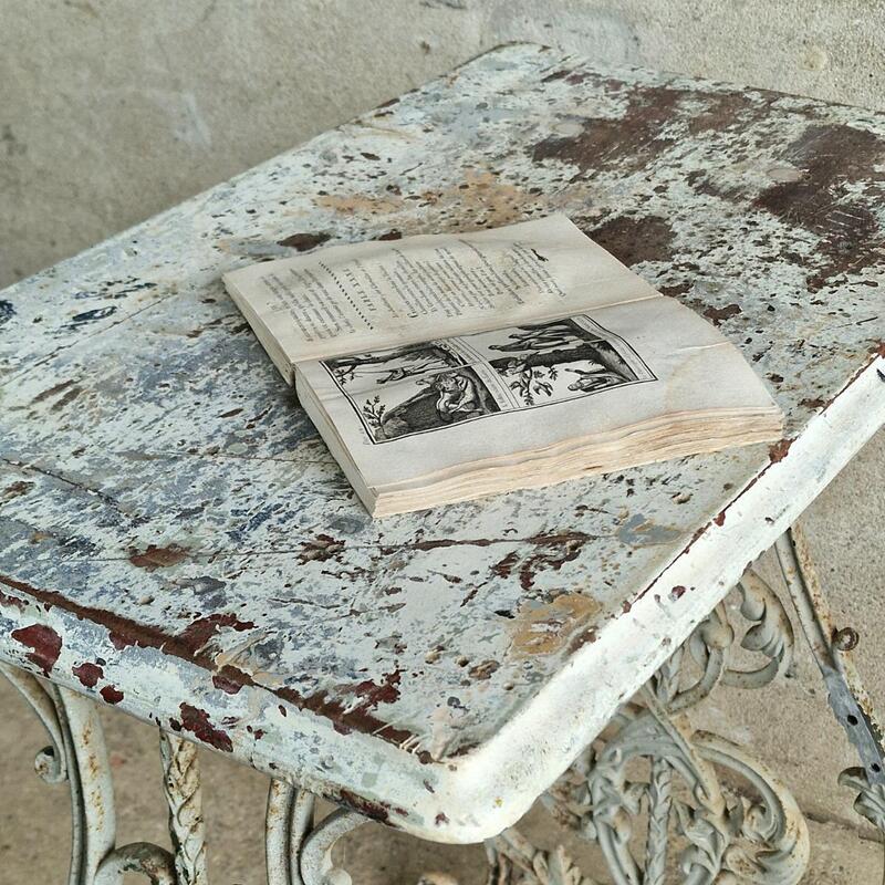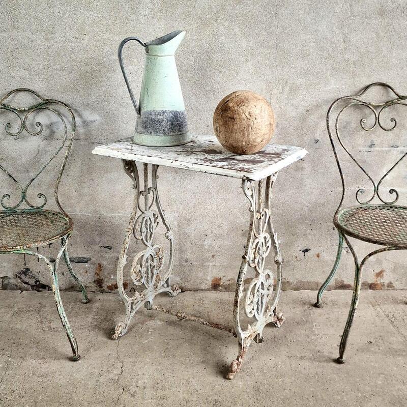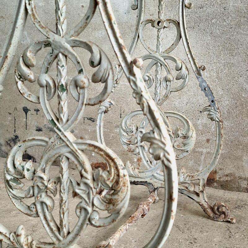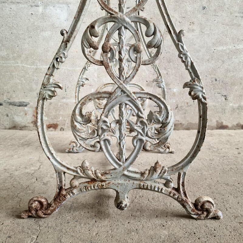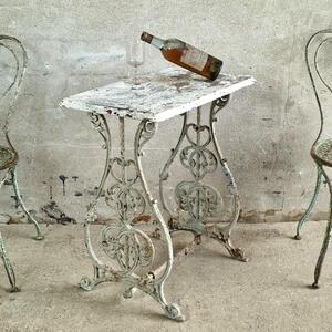 An adorable cute console table made of a ravishing cast iron base and wooden rectangular top, probably an old base of a machine, nicely peeling white paint, good and stable condition, France 1880