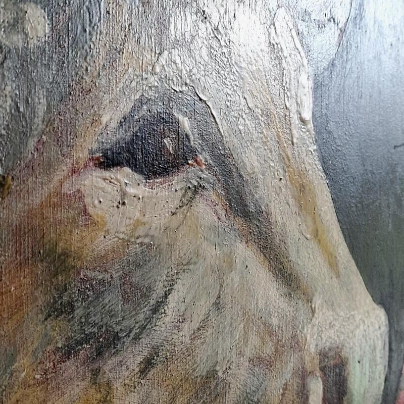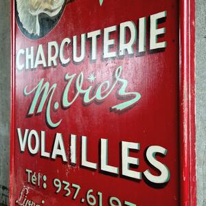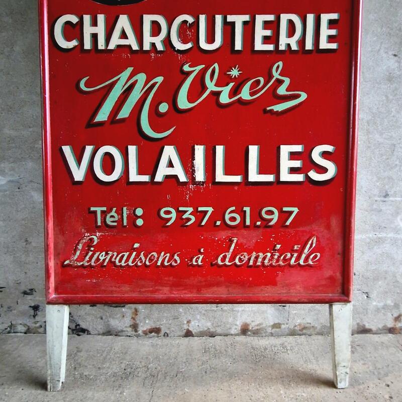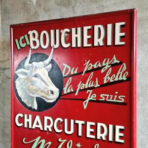 An appealing French butcher's shop sign completely made of wood, delightful large hand-painted panel in the typical vibrant red, very good condition, France 1950