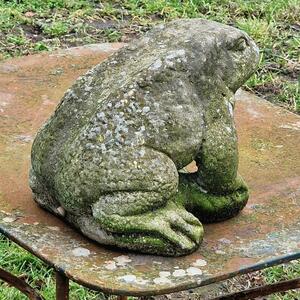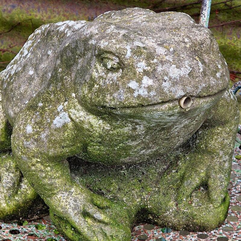 A quite large and funky frog fountain made of cast stone, with awesome weathered patina and some moss, ready to be used, Belgium 1980