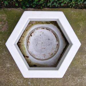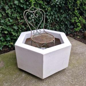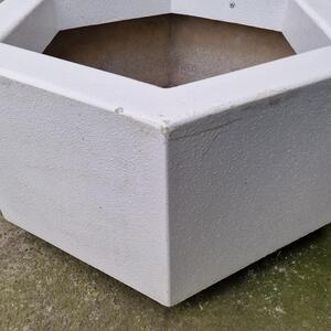 A practical and very large hexagonal planter made of white painted resin, suitable for larger bushes or plants, with drainage holes, some scratches, good used and solid condition, France 1970