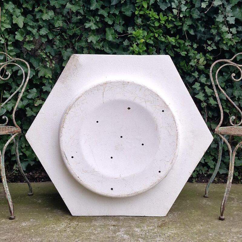 A practical and very large hexagonal planter made of white painted resin, suitable for larger bushes or plants, with drainage holes, some scratches, good used and solid condition, France 1970