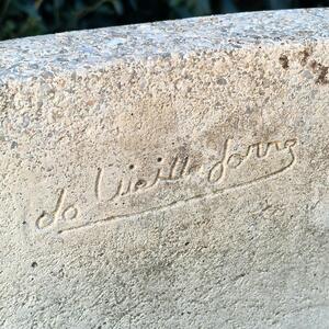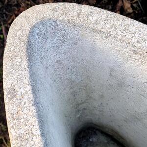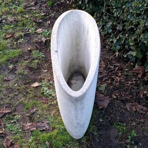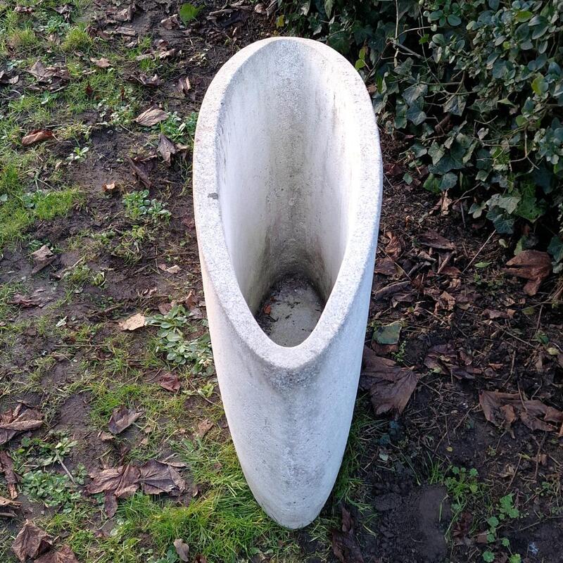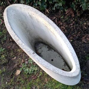 A huge timeless planter in a narrow ellipse shape, slightly weathered white cast stone surface, very unusual model, signed, with drainage hole, very good condition, France 1970