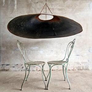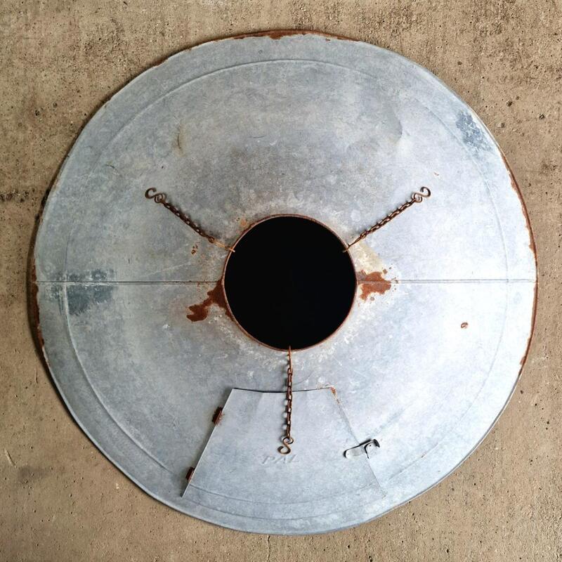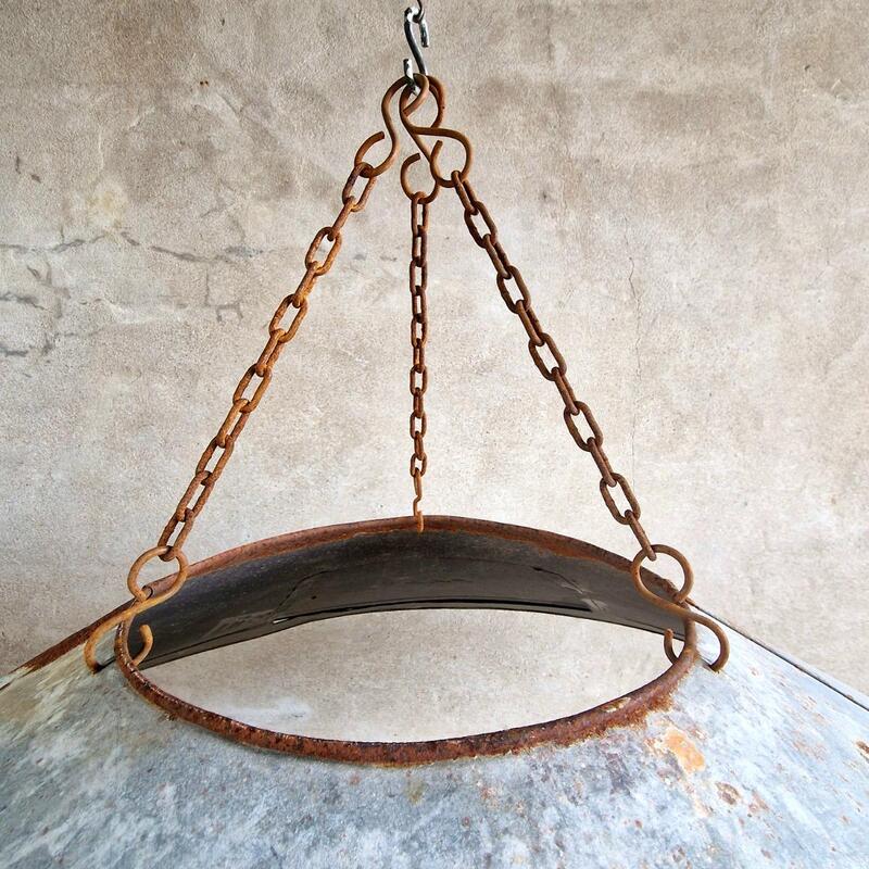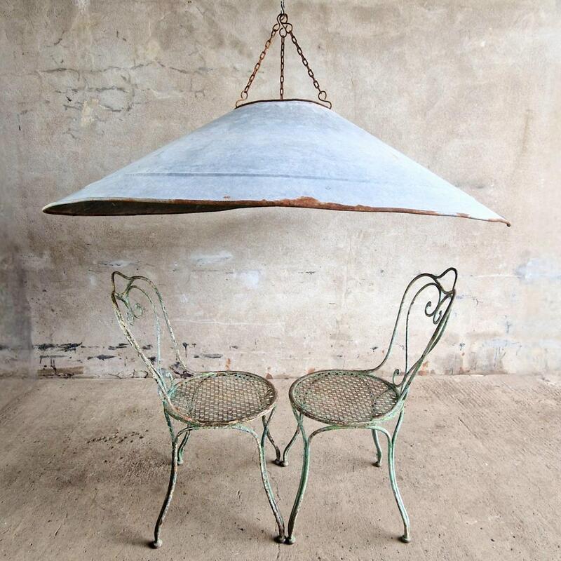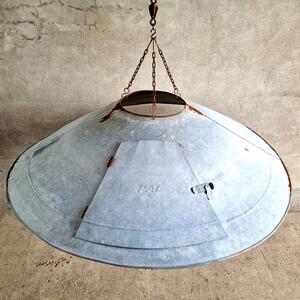 A fascinating huge zinc lampshade that was originally a hood of an extraction system, when electrified will be an imposing chandelier, good original condition, France 1940