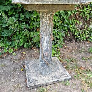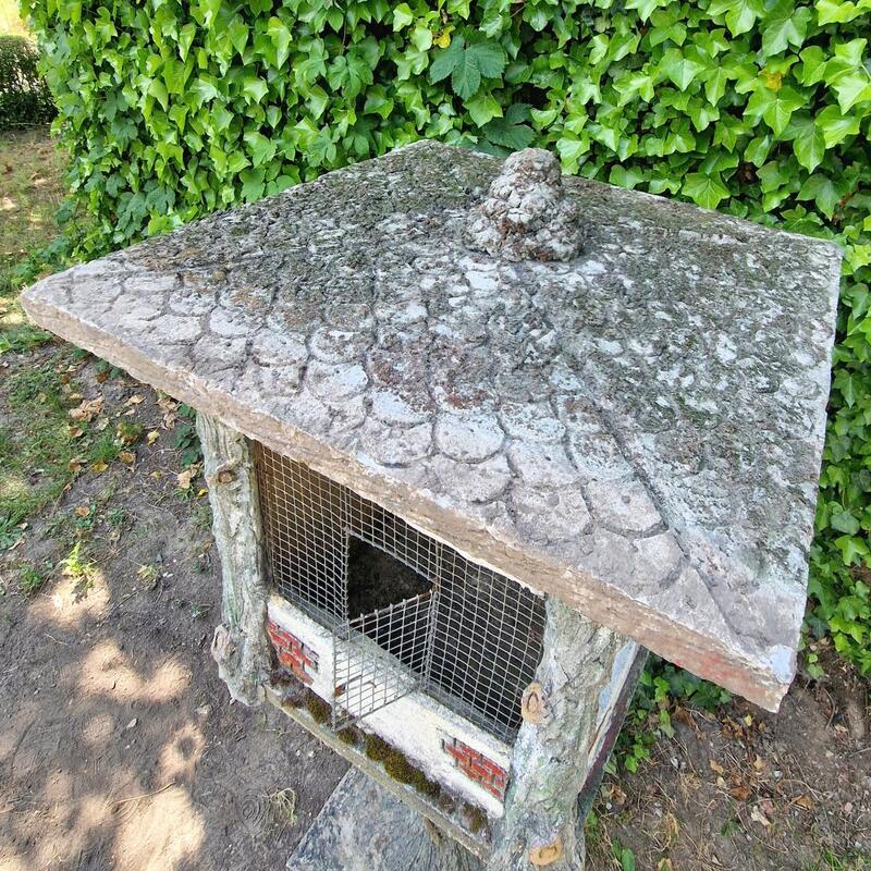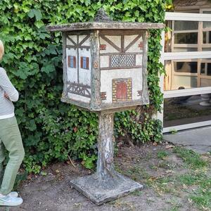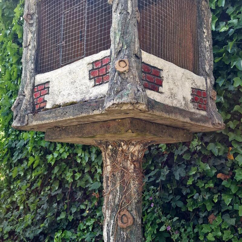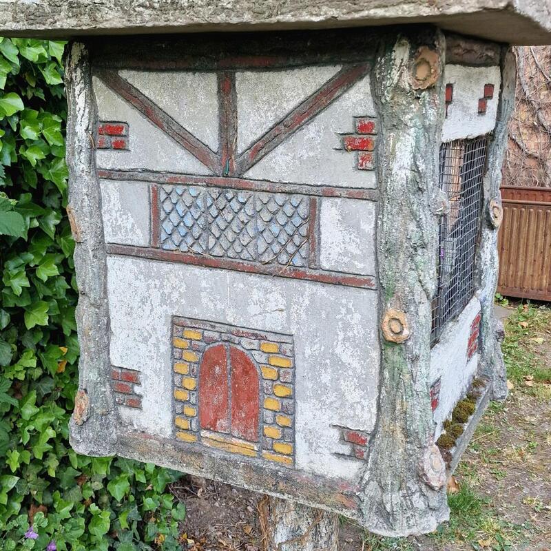 A stunning large faux bois bird cage made of cast stone in the shape of a house in the Normandy style, lovely weathered paint, consisting of a base, body and roof, heavy rare bird house, good condition, France 1960