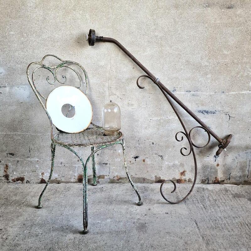 A useful French enamelled wall lamp, a green lamp shade with white enamelled interior and glass dome, with perforated plate ready to hang, good used and weathered condition, France 1920