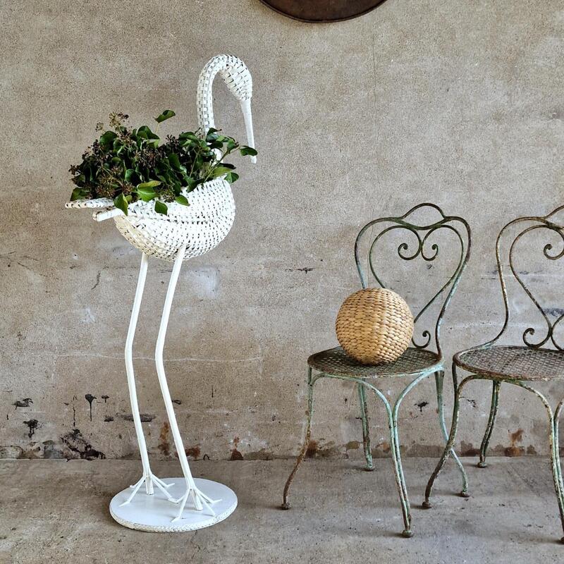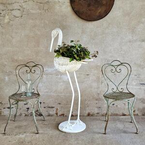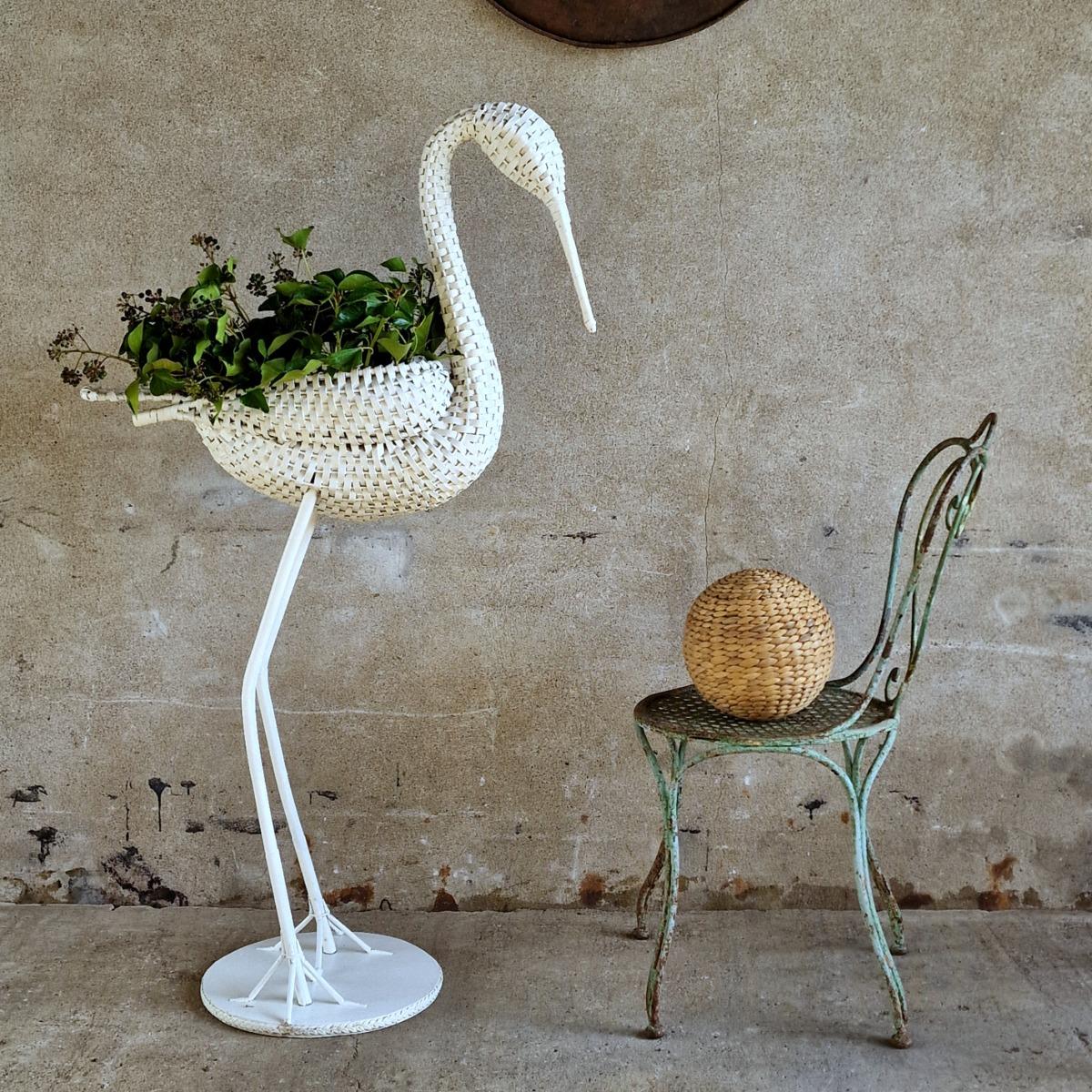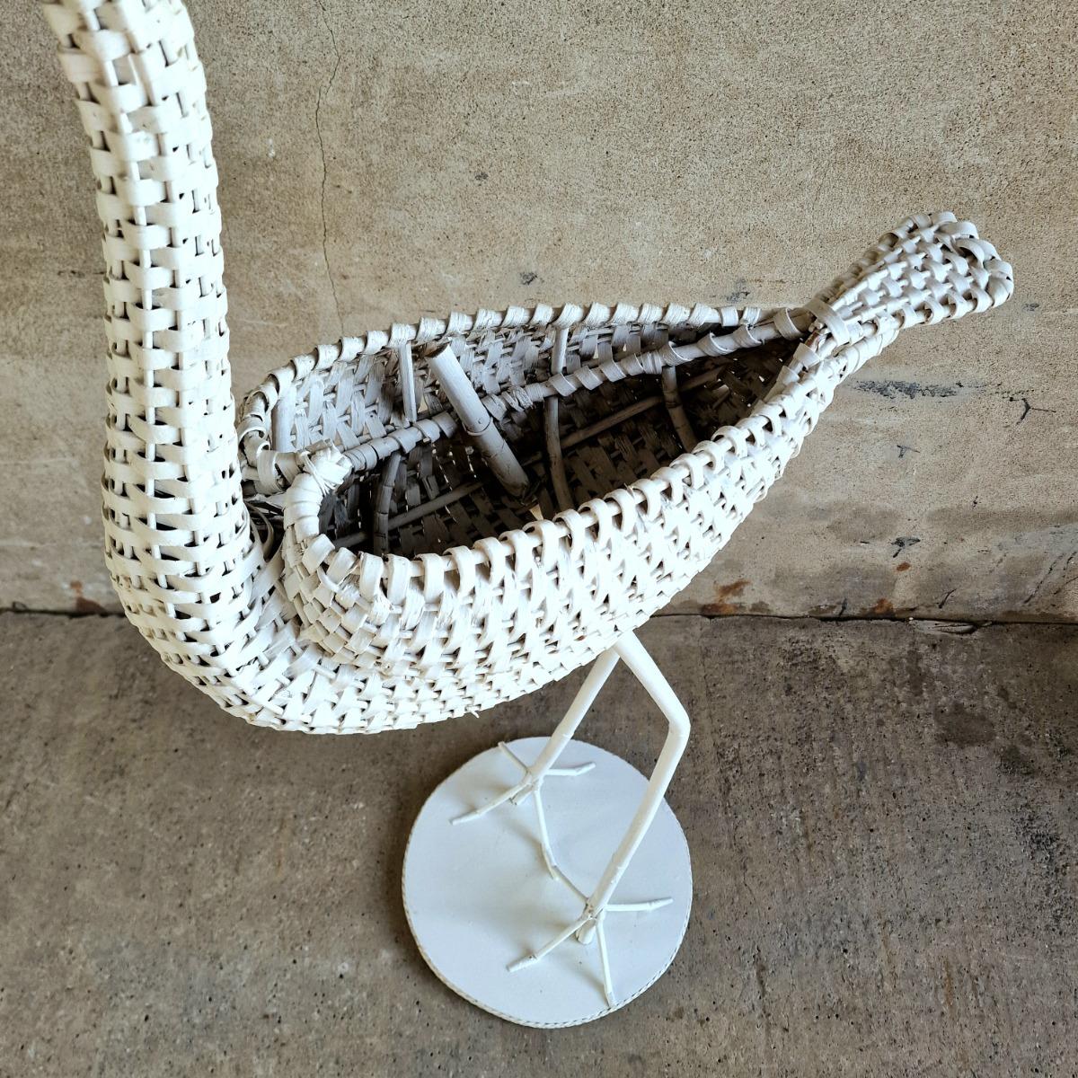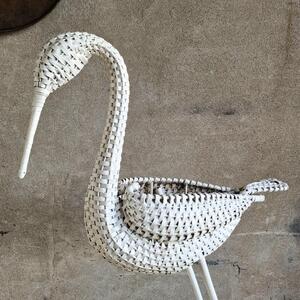 A charming large white rattan stork on attached round wooden plate, opening in the body to put a nice plant or store things, thick white paint, very good condition, Belgium 1970
