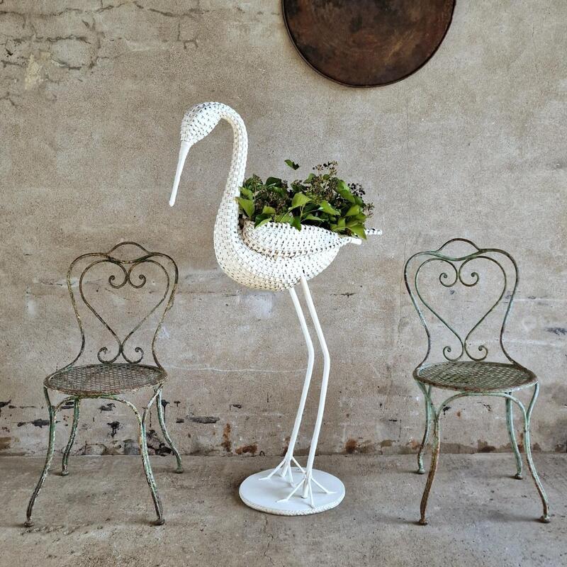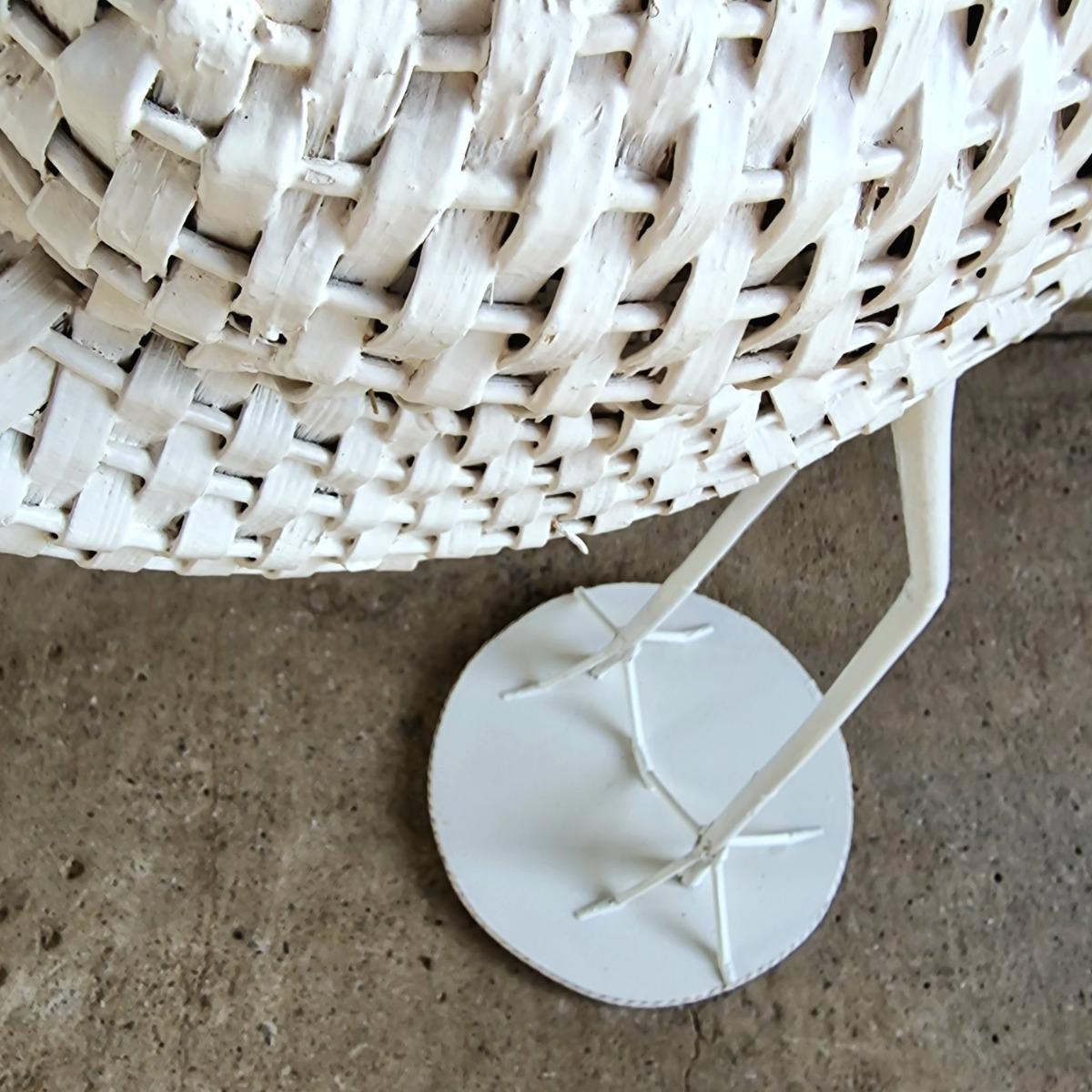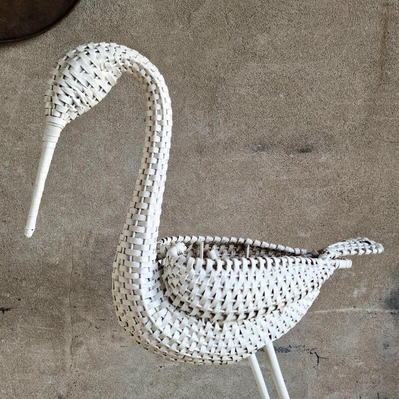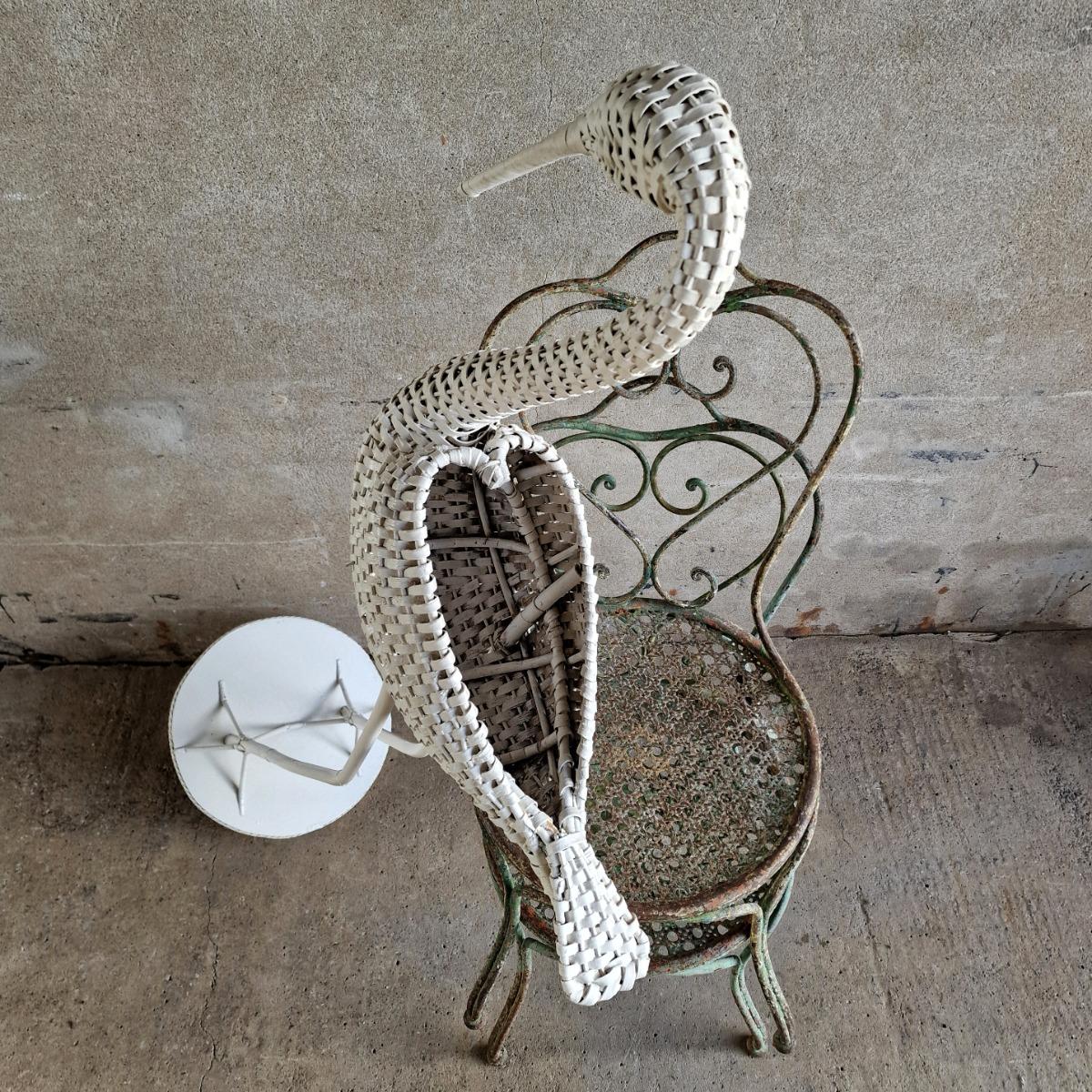 A charming large white rattan stork on attached round wooden plate, opening in the body to put a nice plant or store things, thick white paint, very good condition, Belgium 1970