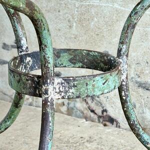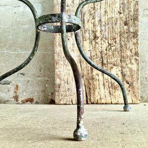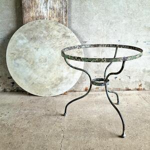 A good looking 19thC marble top garden table with a wrought iron tripod base on ball feet, lovely stripped back green paint on base, slightly weathered white round marble top, very good condition with old restorations, France 1880