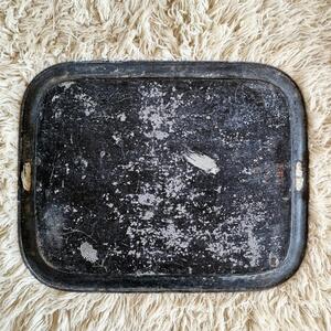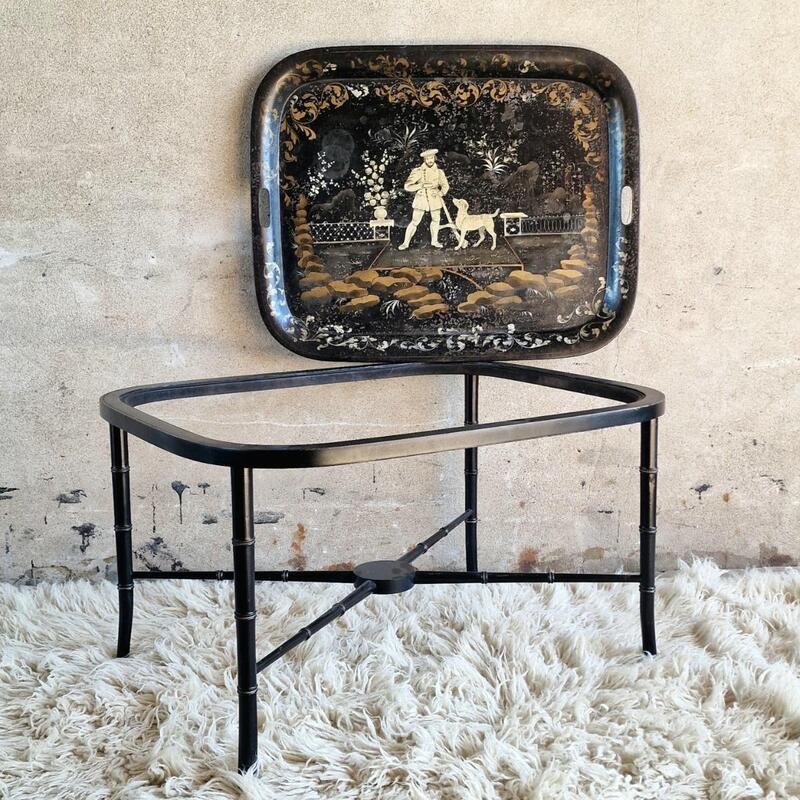 An admirable metal side table with removable hand-painted tray showing a hunter with his dog, on black wooden base with bamboo imitation legs, very good and stable condition, initials and number on backside tray, France Mid 20thC