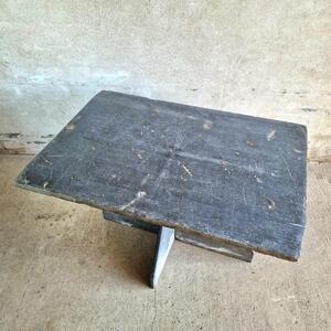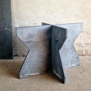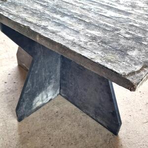 A stunning mid 20thC slate table consisting of a rectangular top and a 2-piece crossed base, top has 2 sides: rough and smooth, signed and dated by the maker, one corner was recut long time ago, good condition with some chips, France 1950