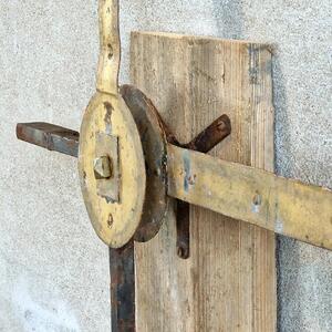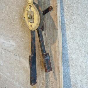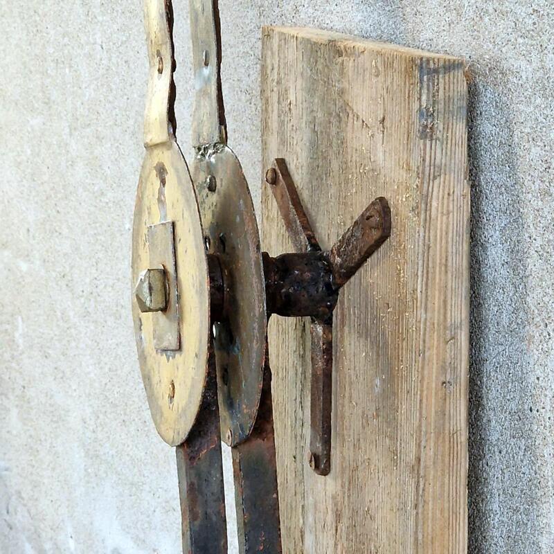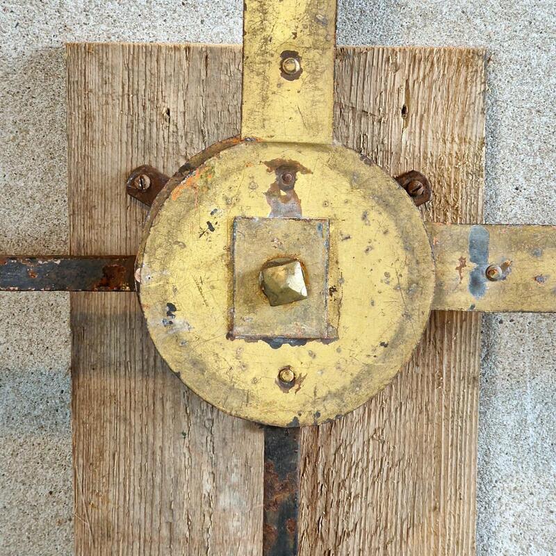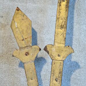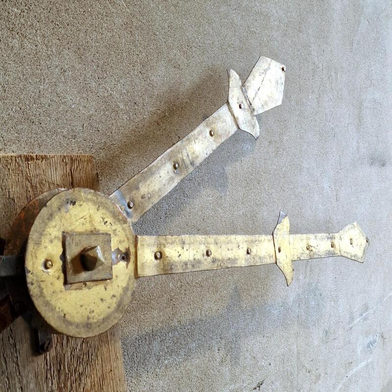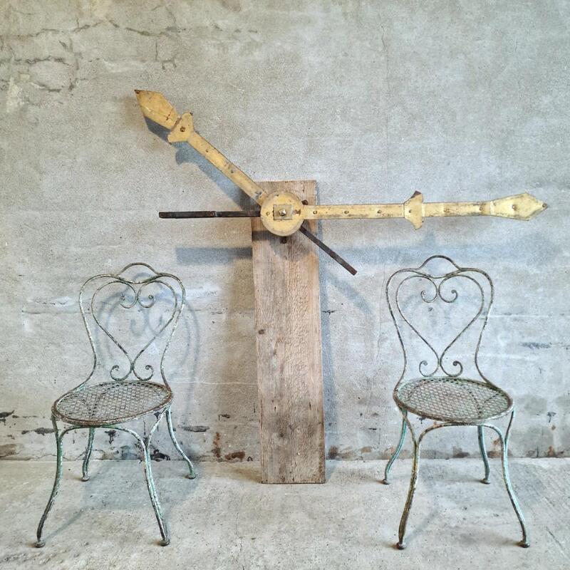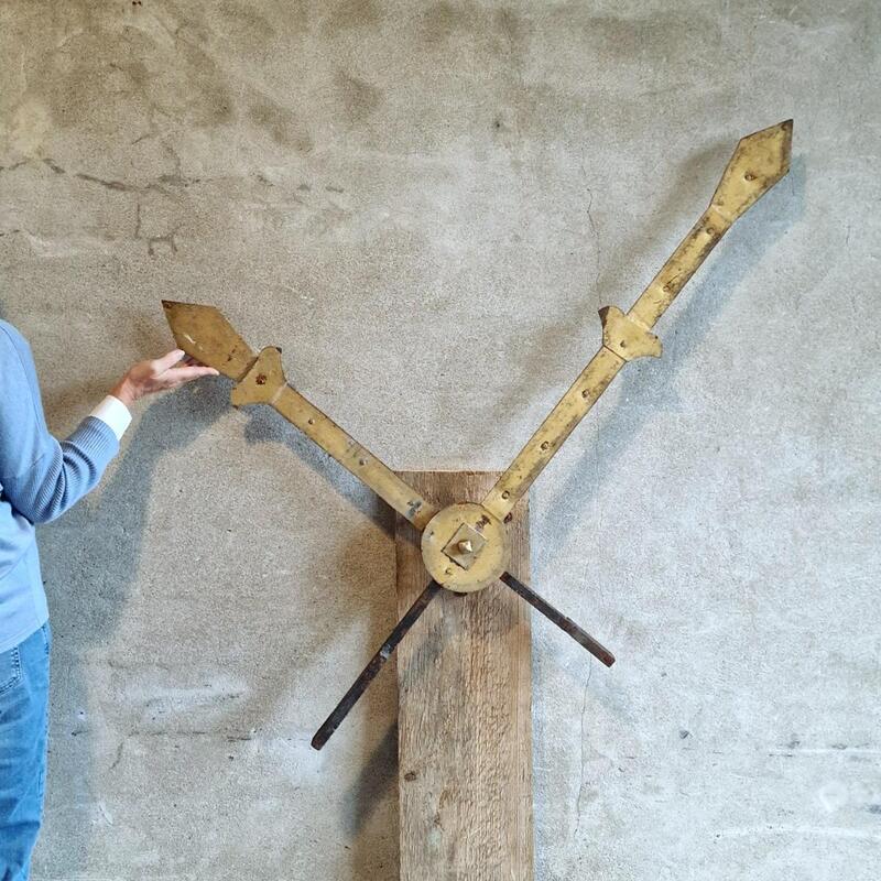 An enchanting pair of oversized clock hands coming from a church tower, made of gilt painted metal, recent support to hang on the wall, weathered surface, good condtion, France 1880
